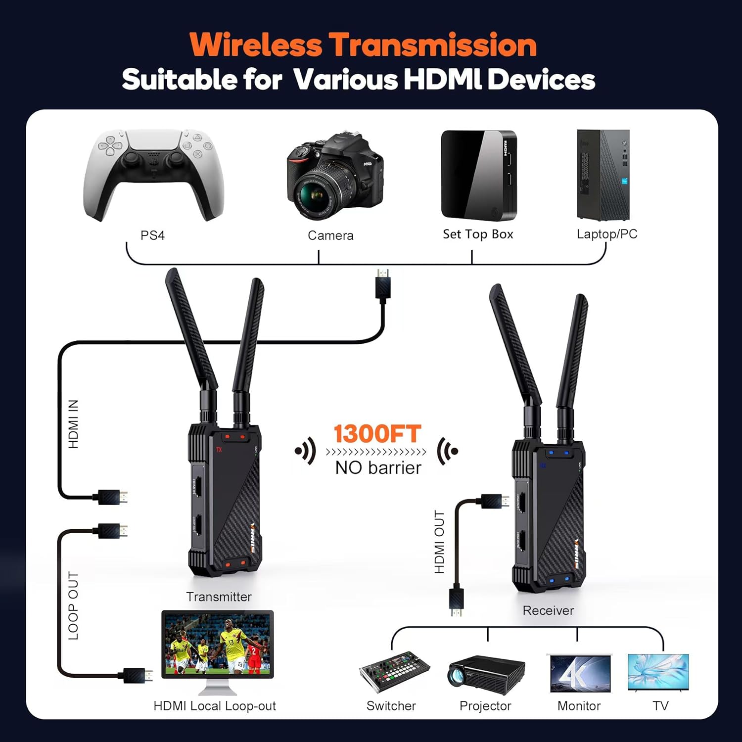 wirelessly extends the 1080P Full HD HDMI signal up to 1300FT in an open