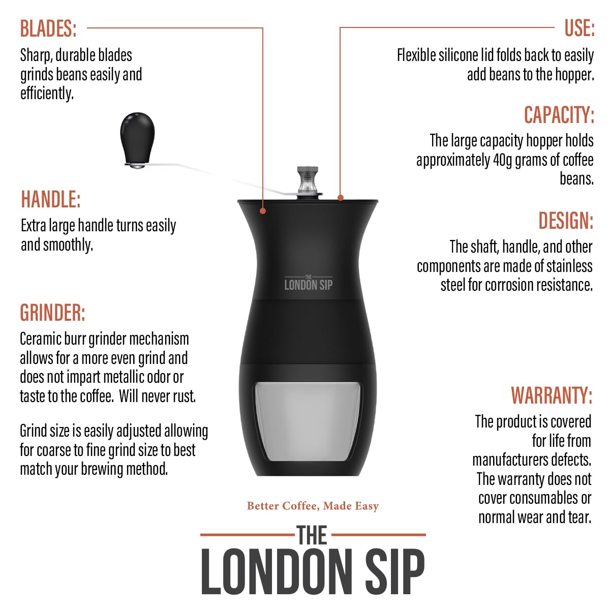• COMPLETE YOUR MORNING ROUTINE ― Whether you are new to grinding your own coffee or a seasoned home barista, the London Sip coffee grinder is a perfect addition to your morning coffee making routine allowing you to grind for any coffee brewing method in your arsenal