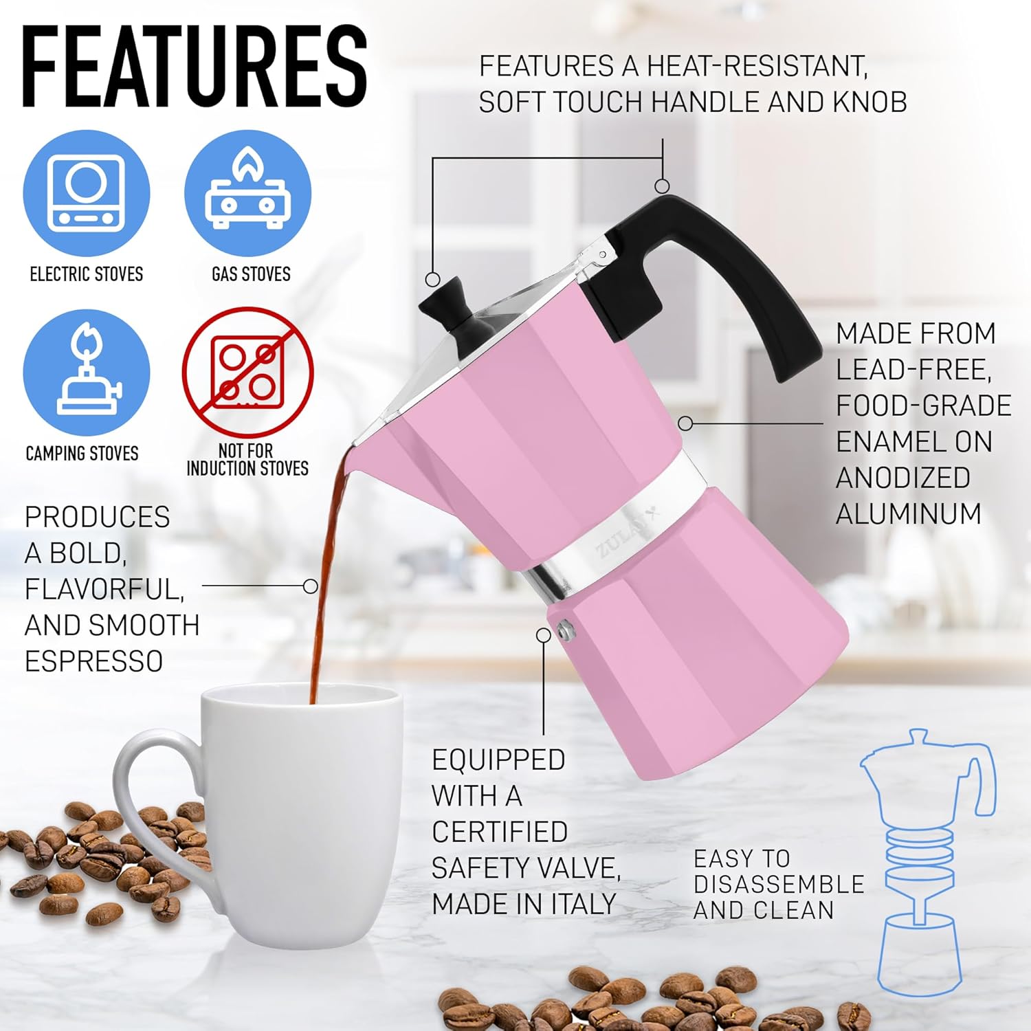 Zulay Premium Moka Pot Espresso Leak Proof Stovetop Espresso - Makes 6 Espresso Cups – Pink