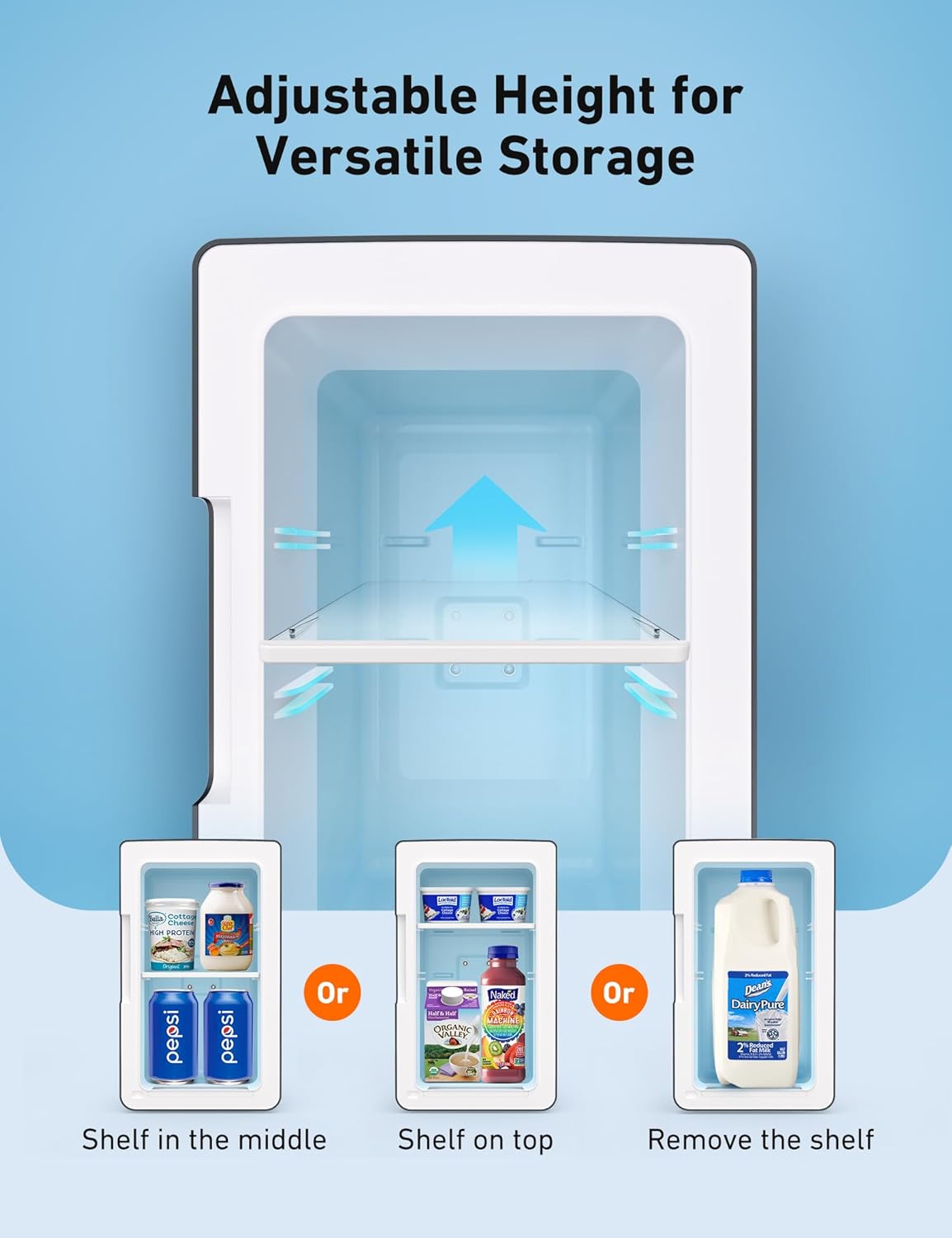or 4*20oz bottles of water. The detachable shelf lets you easily store