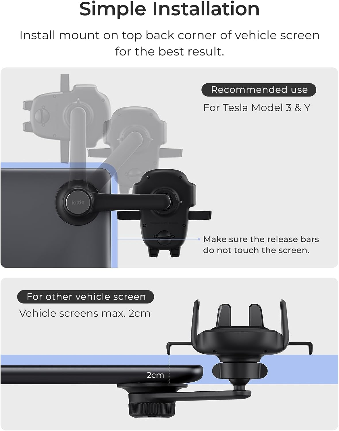 - Easy and Secure Installation: Seamlessly installs on the back of any flat vehicle screen via semi-permanent 3M adhesive. Extra adhesive base included.