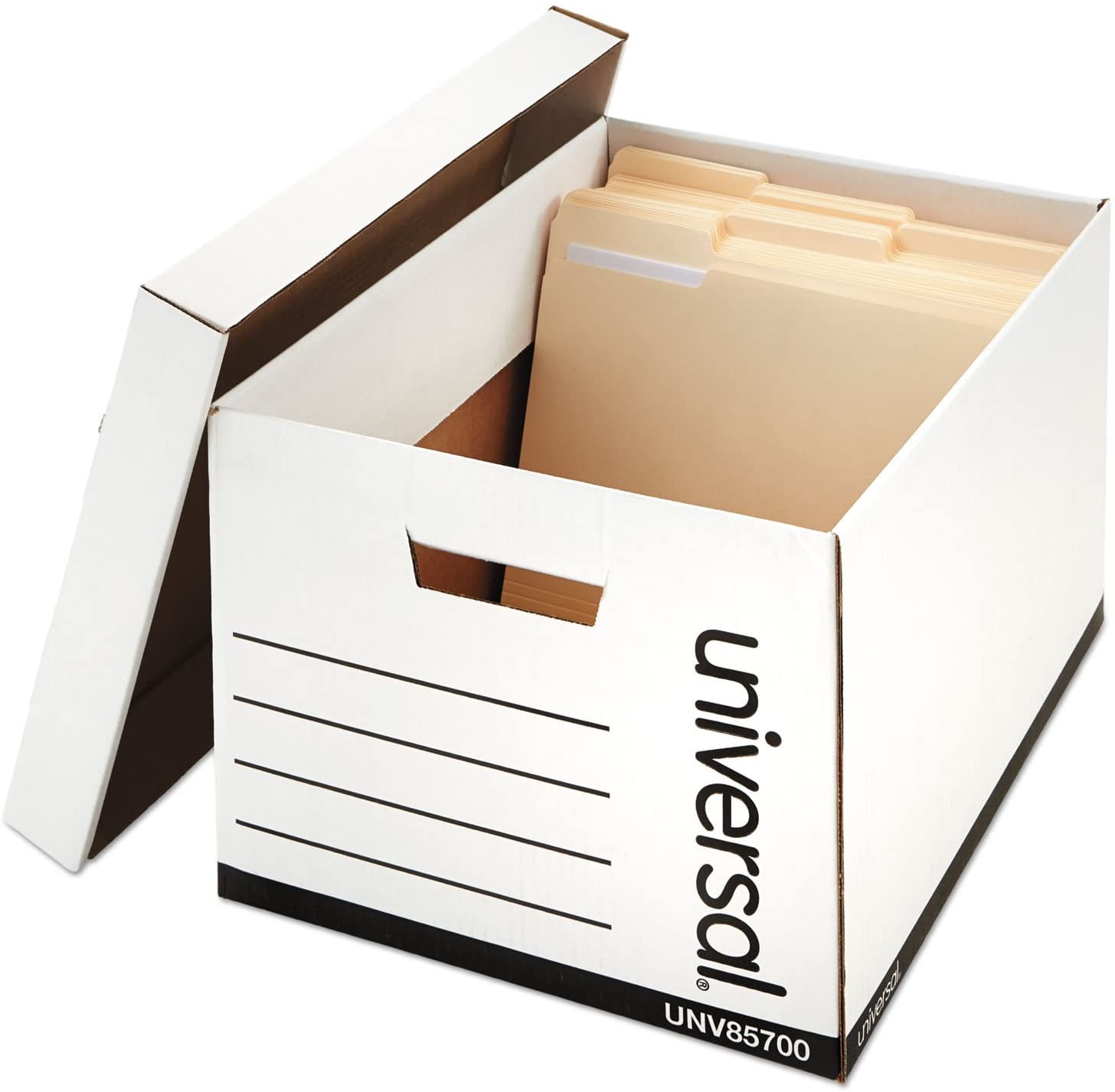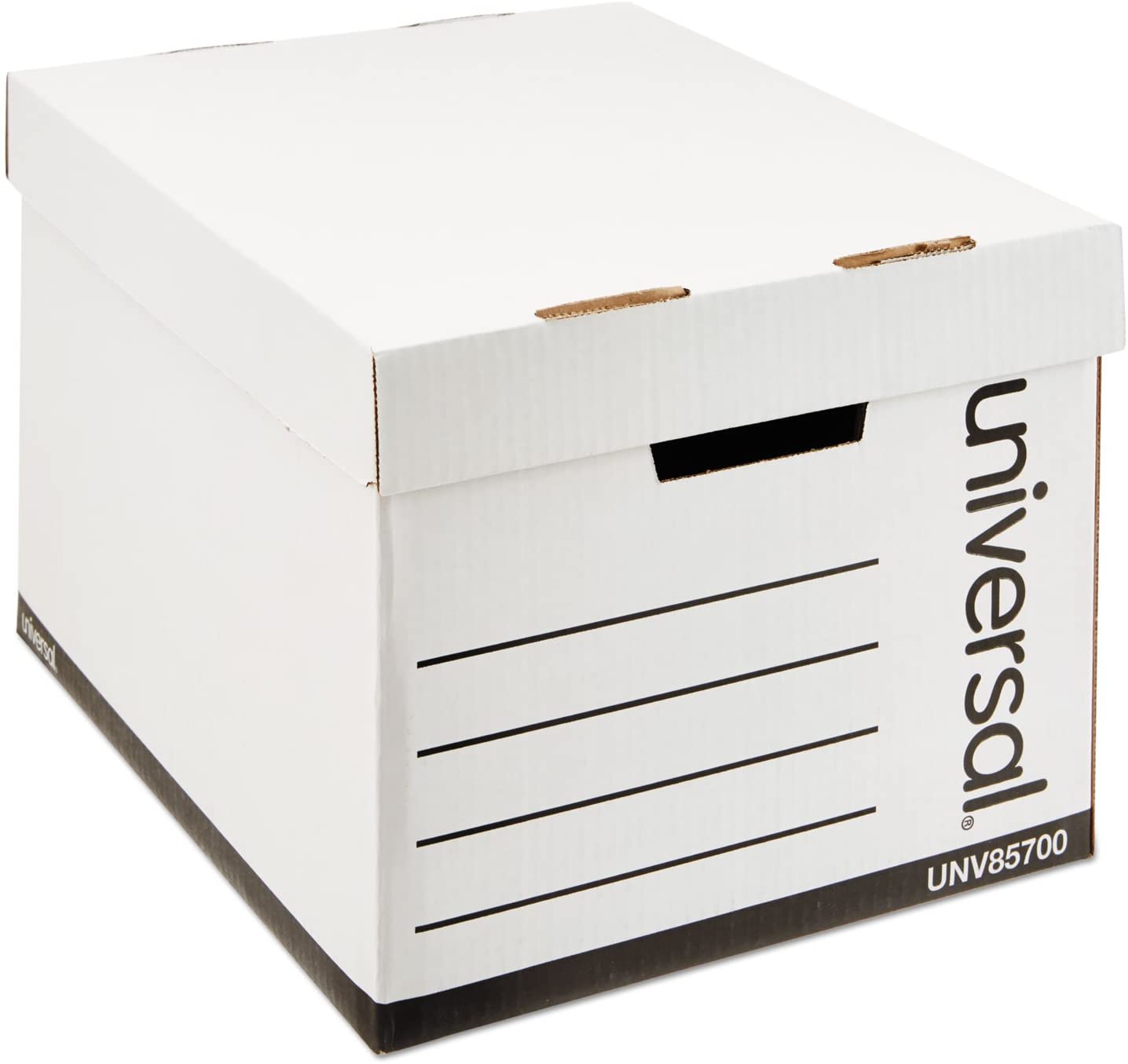 This Universal UNV85700 12" x 15" x 10" storage box keeps important letter and legal sized documents protected and organized. Featuring a secure lift-off lid, this storage box is perfect for offices, small businesses, and payroll departments. The box can even support up to 525 lb. of evenly distributed weight, making it a valuable space-saver, and thanks to the plain white design, you can easily label the box for quick identification.