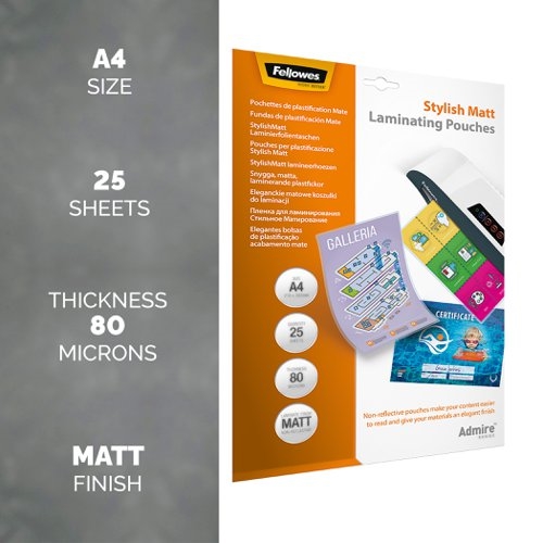 Fellowes A4 Laminating Pouches Matt Finish 25 Sheets 80 Micron High Quality Finish Makes Content Easier to Read