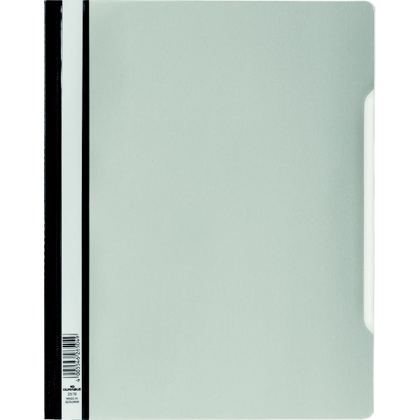 DURABLE flat file, A4, hard film, gray over wide view stapler with transparent front cover, labeling strip over the entire height. Loose-leaf binders, PVC, BROADLOOM • Format: A4 • Visual stapler from rigid film • with transparent front cover • Labeling strips over the entire height Accessories: suspension rail: made of metal • for insertion into appropriate DURABLE stapler for storage in hanging file Application examples: - For archiving punched records - Also suitable for filing the prospectus Cases