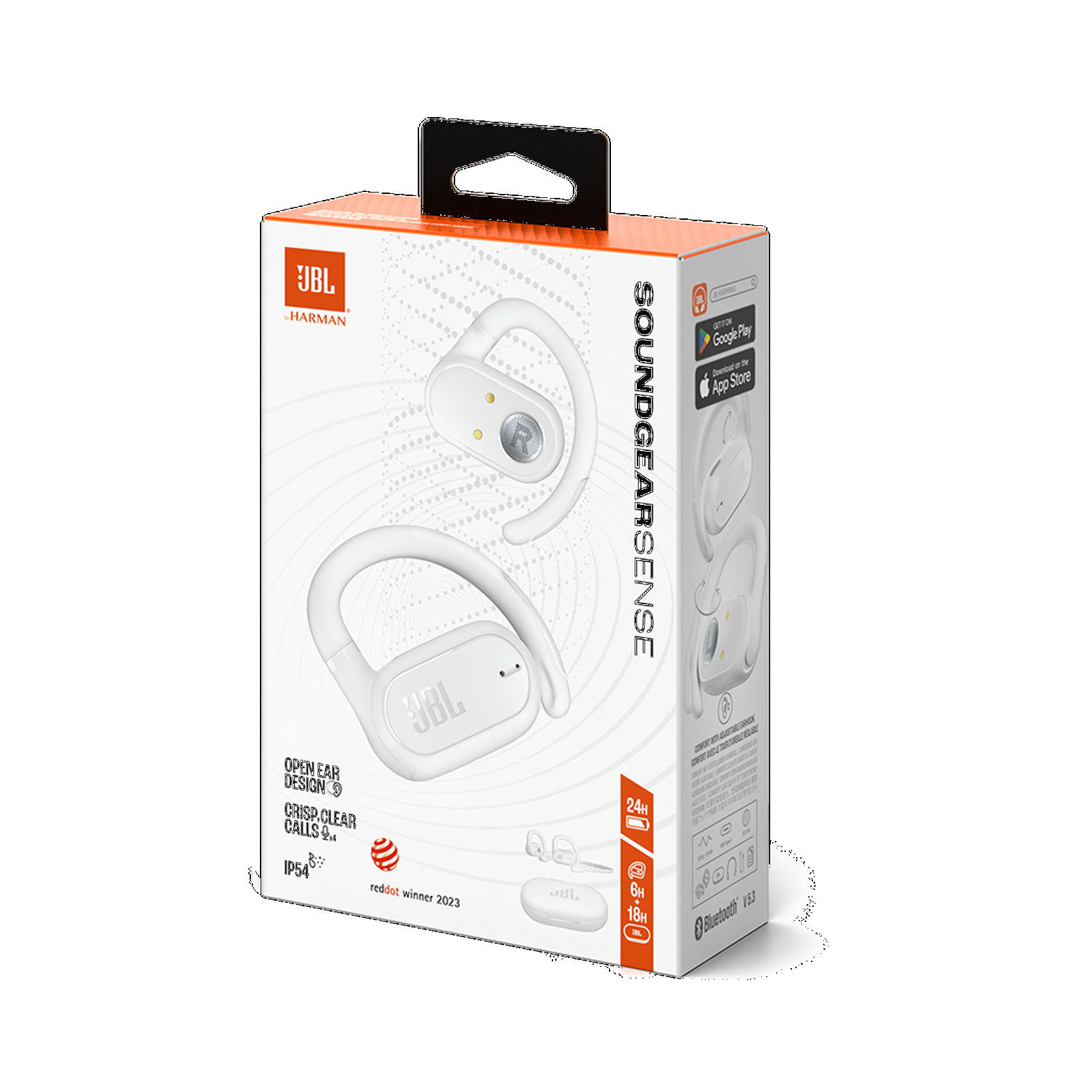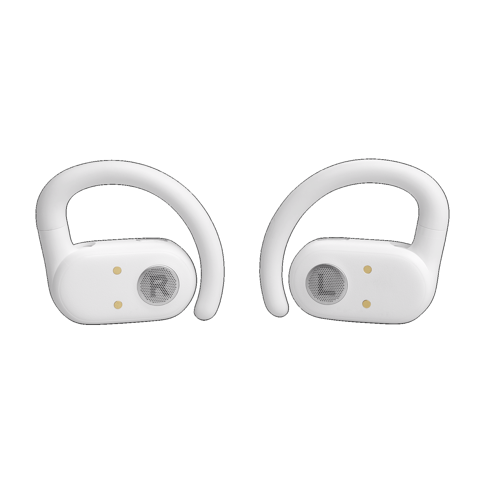 JBL Soundgear Sense true wireless open-ear headphones feature JBL OpenSound Technology with air conduction, which doesn't completely close off your ear canal, making them comfortable enough to wear for hours. Flexible earhooks rotate, so you can choose whether you want to focus on your music or calls, or let in more sound from the world around you. A detachable neckband provides an even more secure fit while you're working out, and an IP54 rating means that they can stand up to sweat—or even a light rainfall. Your voice will be crystal clear, even on a windy day, thanks to four voice mics. Customize how you use the intuitive touch controls on each earbud to handle your music and calls with the My JBL Headphones app. JBL Soundgear Sense is as adaptable as you are.