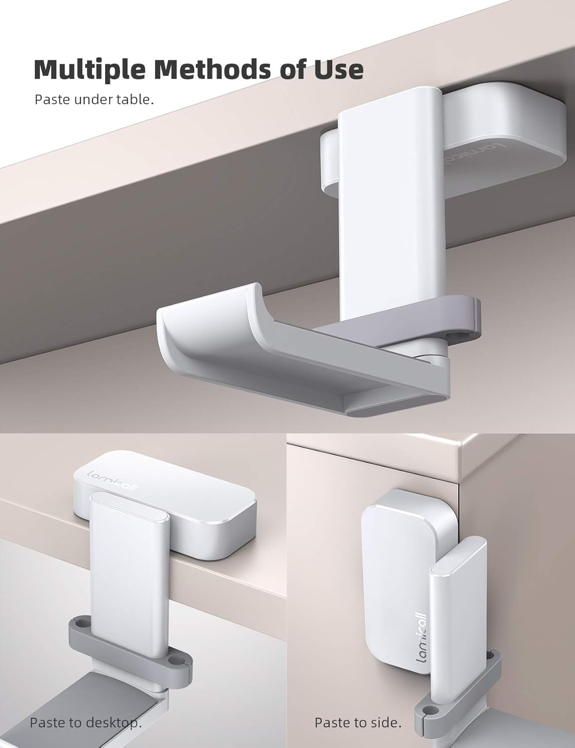 • 360 Degree Rotation - This stick headphone hanger with dual 360 degree rotation arm, Can be applied to different positions. Can paste under table, paste to desktop, paste to the side of cabinet and other smooth surfaces..
