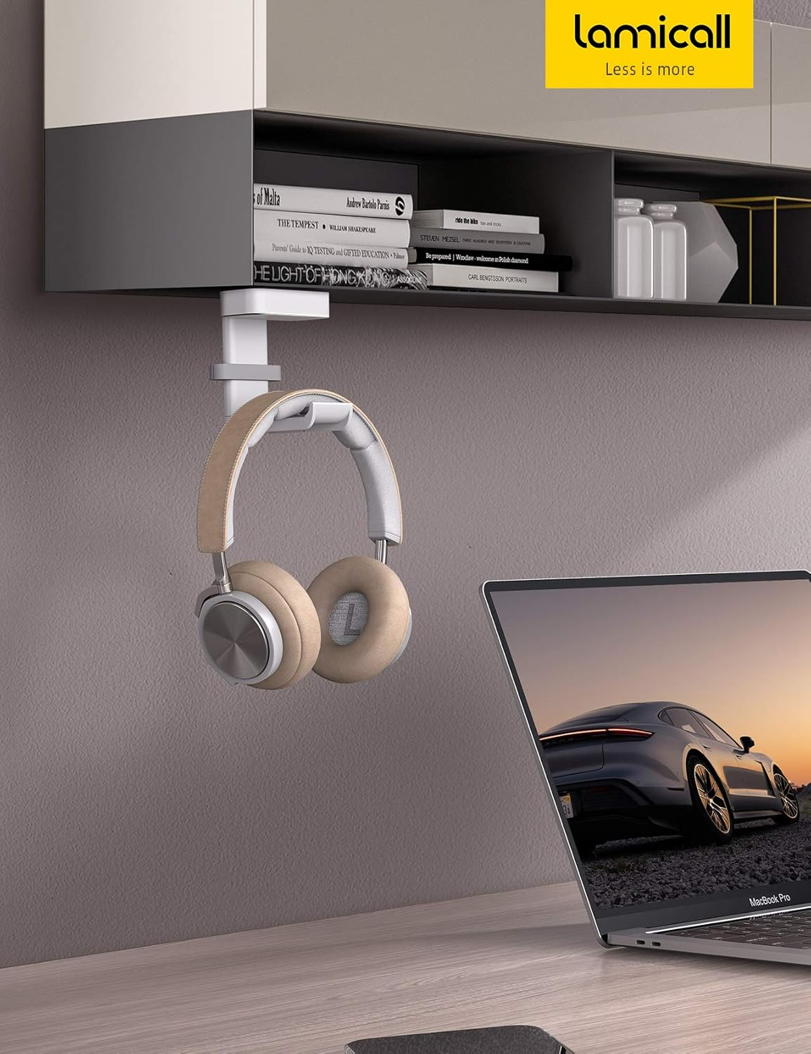 Lamicall Headphone Stand, Sticky Headset Hanger - 360 Degree Rotation Earphone Adhesive Hook Holder Mount, Table Headphone Stand with Cable Organizer, Headset Clamp for HyperX, Sennheiser -White