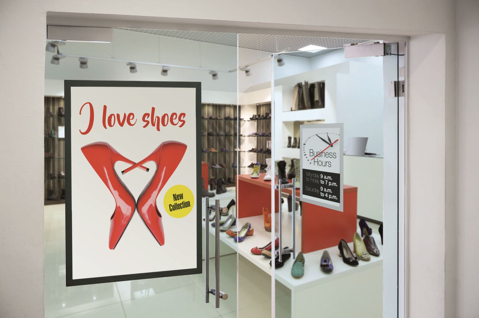- The frame can be fastened to the inside of a shop window pane for outside viewing.