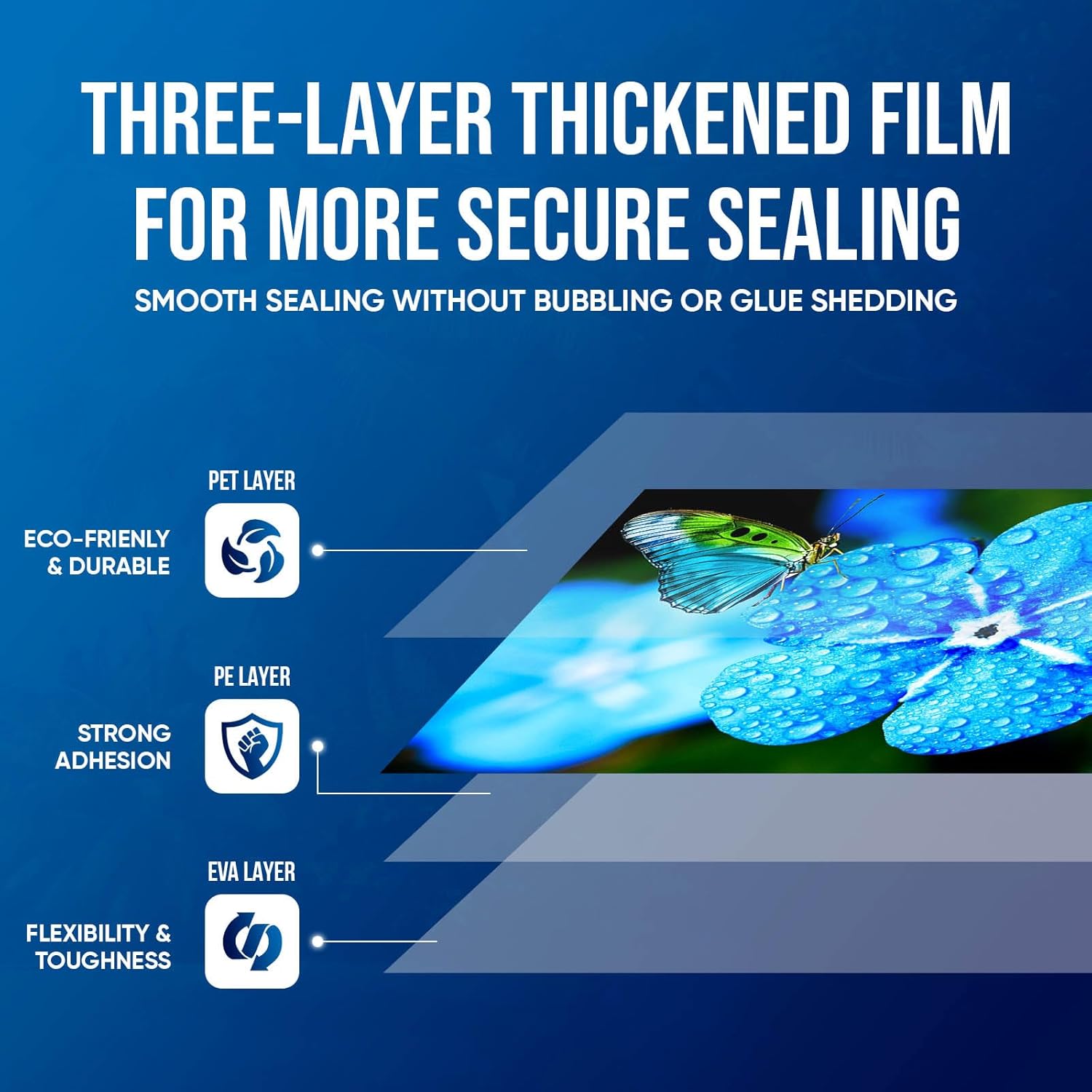 • THREE-LAYER THICKENED FILM - Ensure document integrity with Rolett laminating sheets featuring a three-layer thickened film. The PET layer ensures eco-friendly durability, the PE layer provides strong adhesion, and the EVA layer adds flexibility and toughness, maintaining document quality over time.