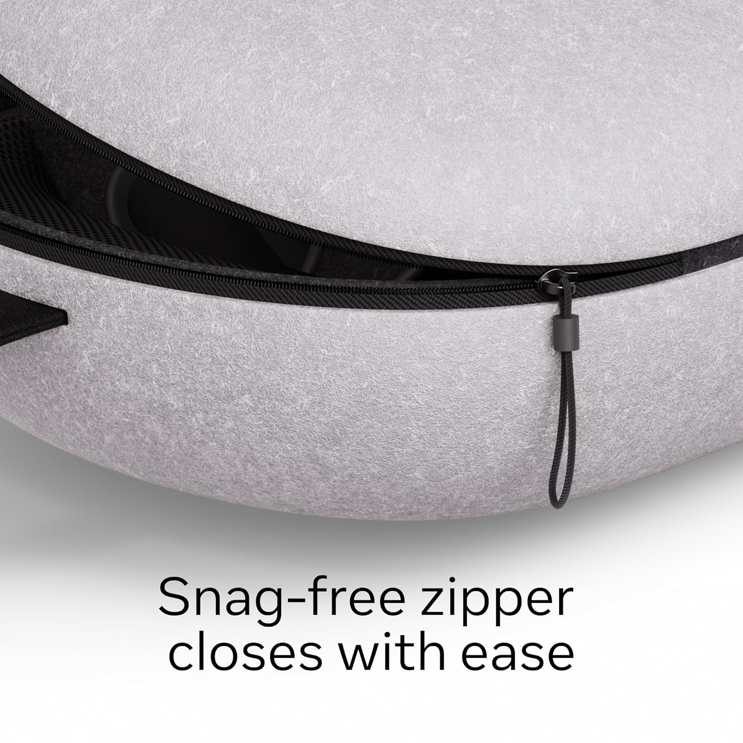 For a space-saving solution to safely transporting your VR gear, look to the Meta Quest Compact Carrying Case for Quest 3/3S. The short, rounded profile makes every inch count, giving you enough space inside to fit your Quest 3 or Quest 3S headset with standard headstrap attached. There's also a molded insert with slots for each of the Touch Plus controllers, along with a microfiber compartment to hold the charging cable and power adapter. On