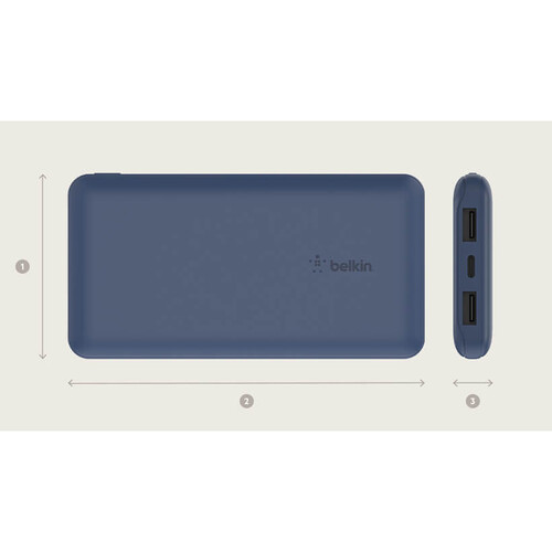 Charge three devices at one time with the 10,000mAh BoostCharge Power Bank in blue from Belkin. Featuring two USB-A outputs and a USB-C input/output, this 10,000mAh power bank delivers 15W of power when charging up to three devices, respectively. Compatible with tablets, phones, and more, it features a portable design, an LED indicator, and comes with a 6" USB-A to USB-C cable.