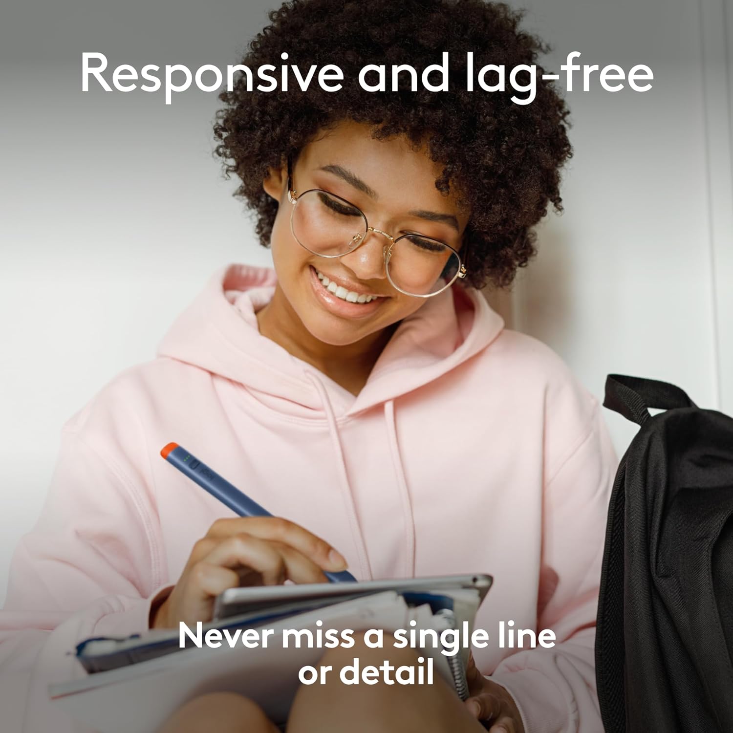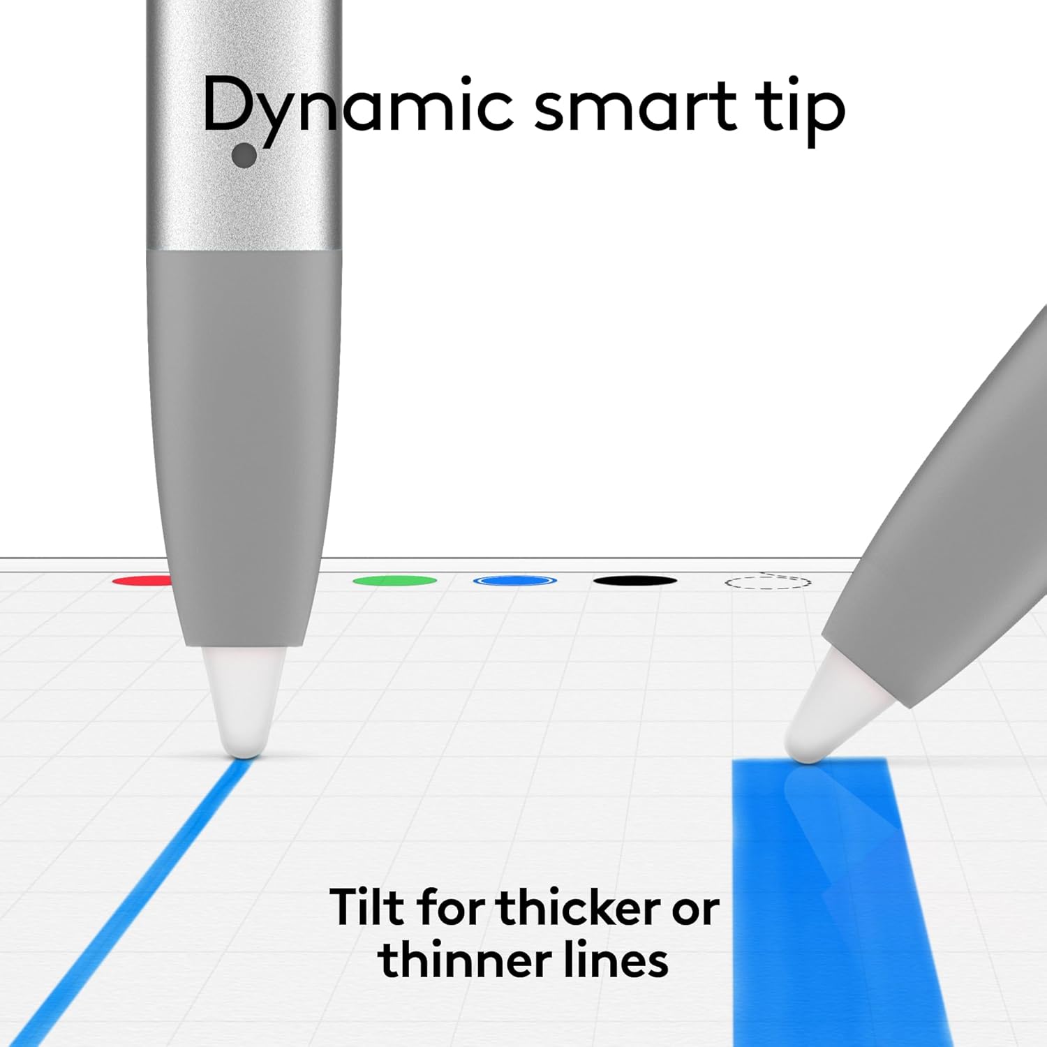 Logitech Crayon Digital Pencil for iPad models with USB-C ports featuring Apple Pencil Technology, Anti-roll Design, and Dynamic Smart tip.