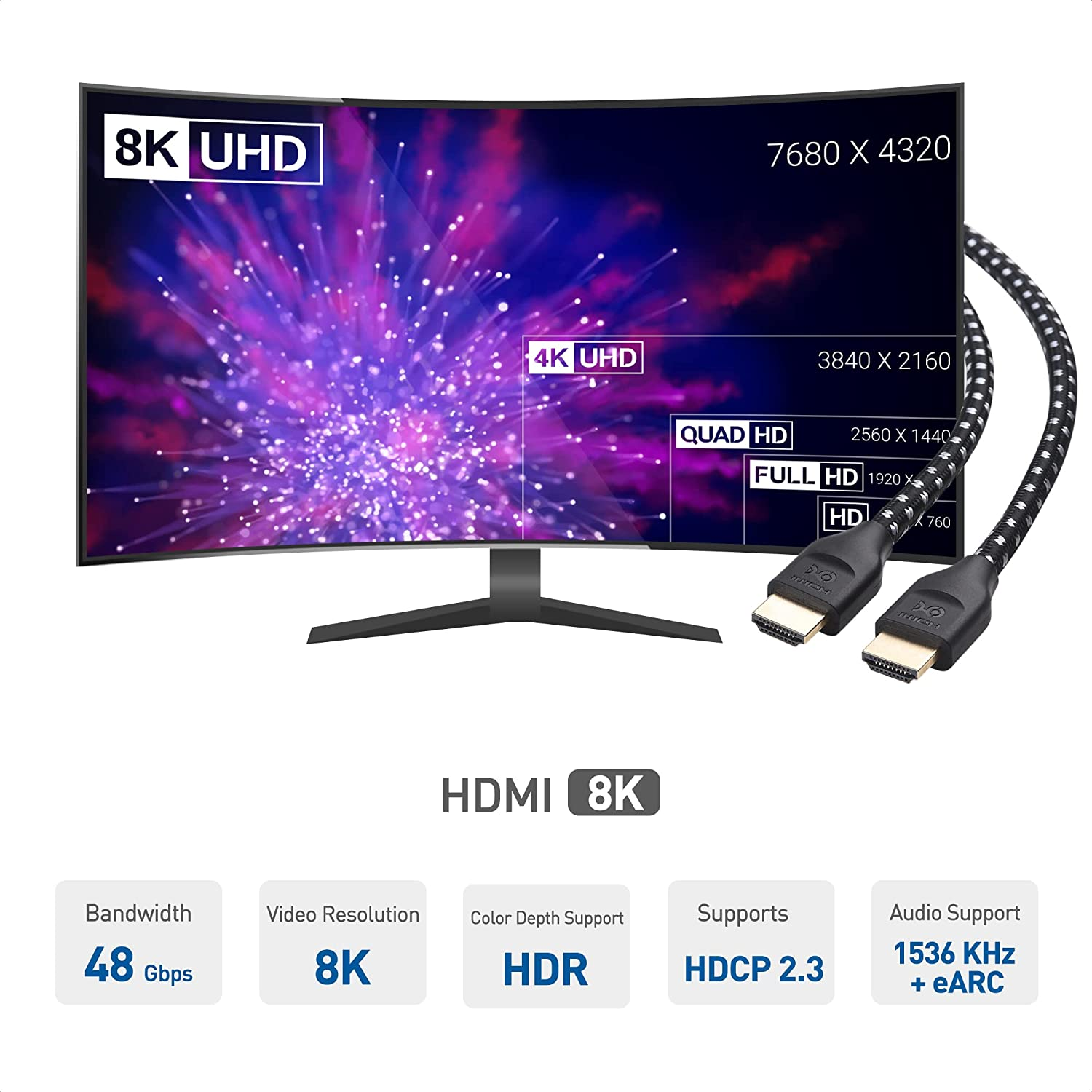 - High speed HDMI to HDMI cable supports up to 8K (7680x4320) including 4K and 1080p; Fully compatible with HDMI eARC (Enhanced Audio Return Channel) features for immersive audio support including Dolby Atmos and DTS X surround sound 7.1 and 5.1