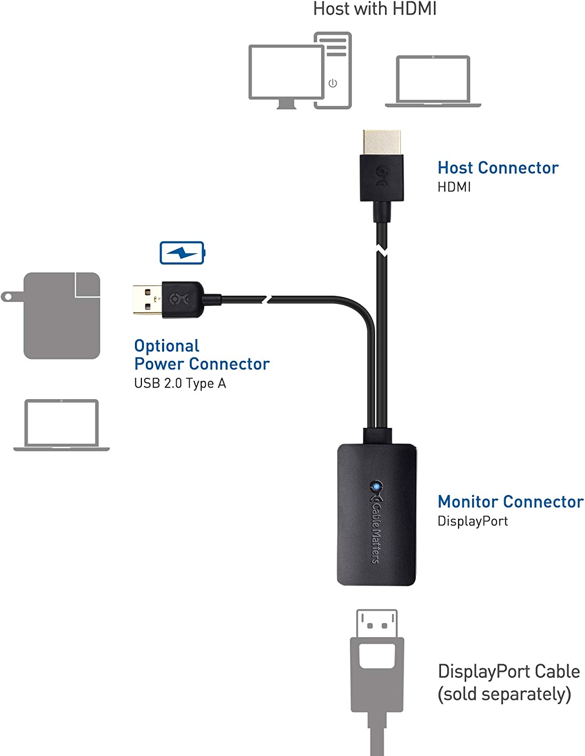 - HDMI to DisplayPort cable adapter connects a computer or laptop with HDMI to a monitor with DisplayPort input; A DisplayPort cable (sold separately) is required for this HDMI male to DisplayPort female adapter
