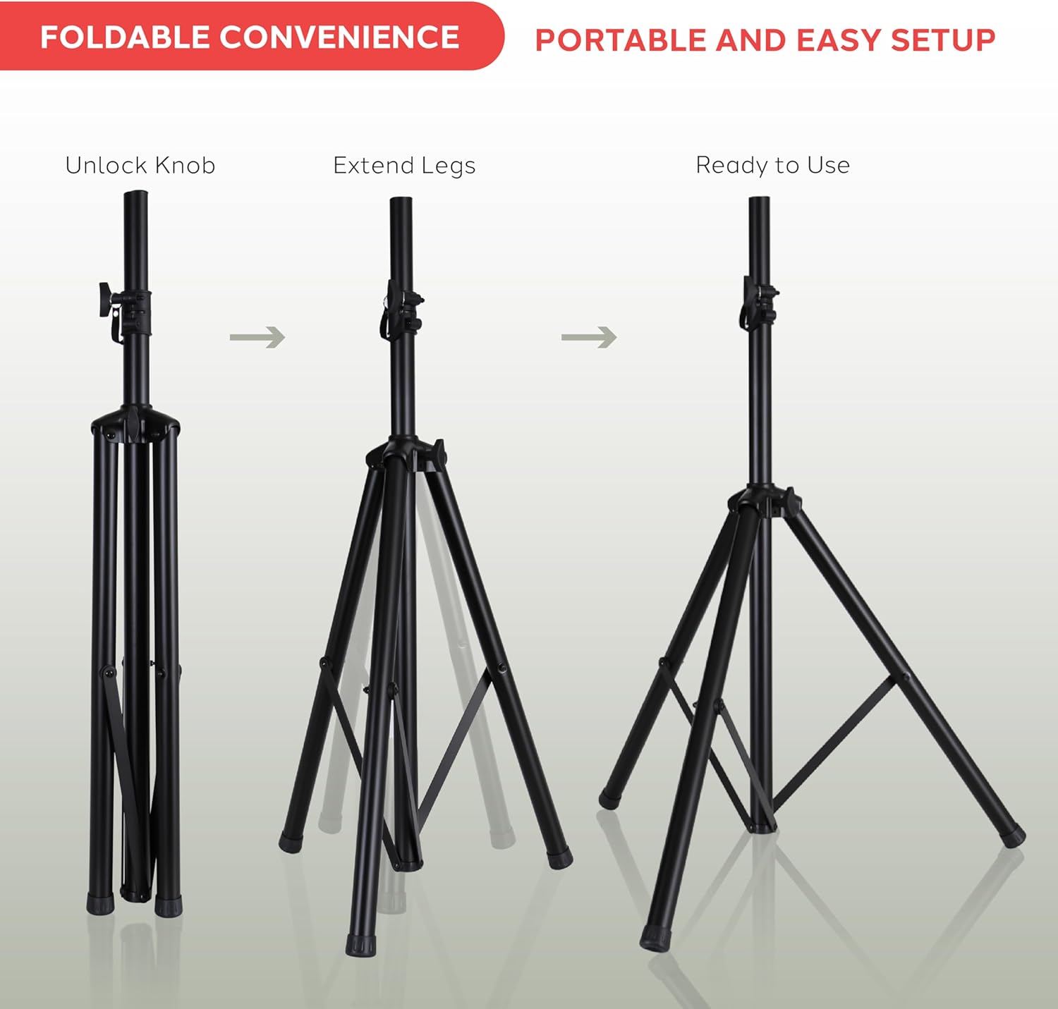 • Tripod Leg Design: Center brace connects tripod legs for increased stability; The tripod speaker stands collapse easily to fit inside the bag for easy transportation It can hold speakers of up to 132 pound firmly and steadily for better sound effect