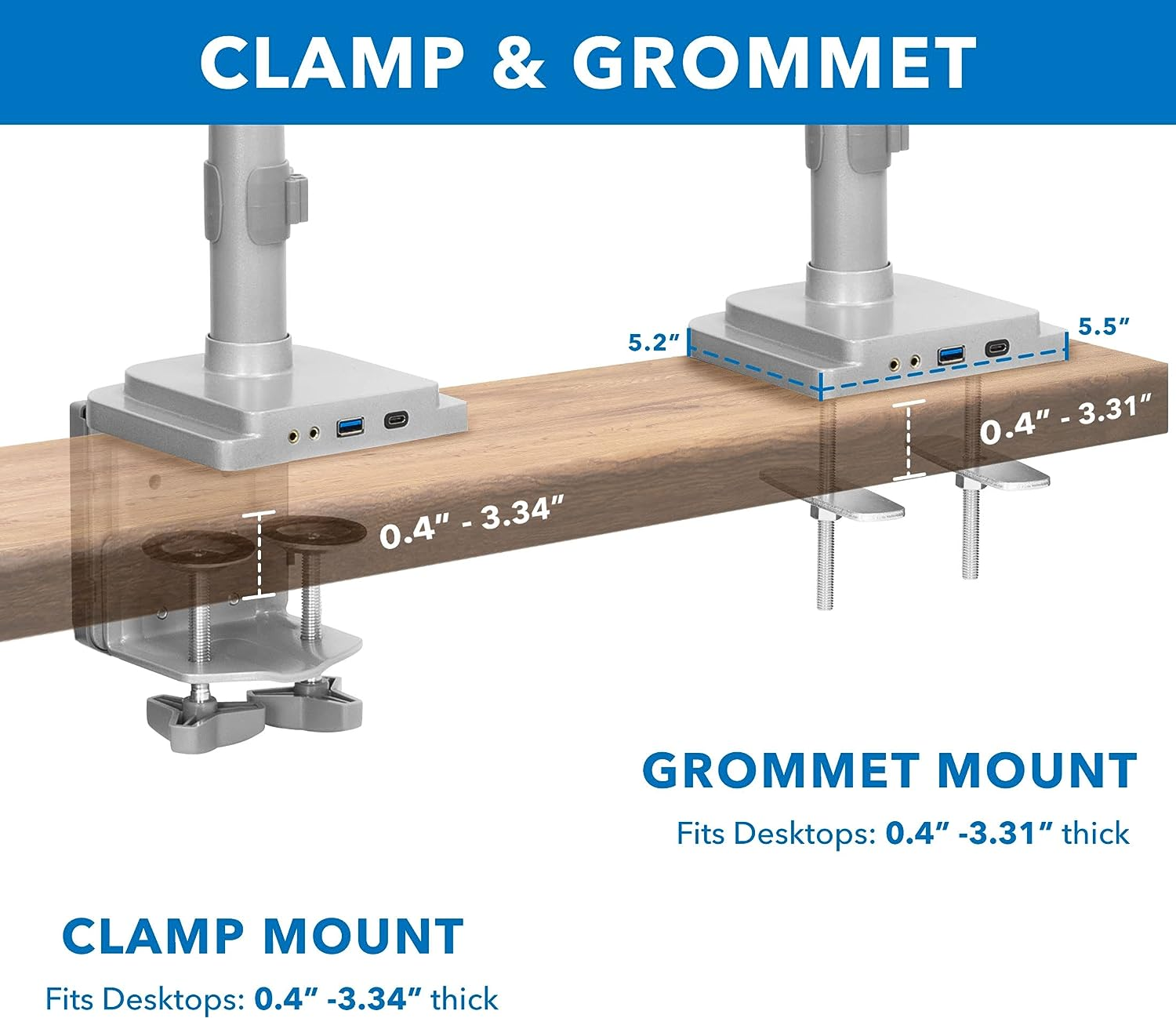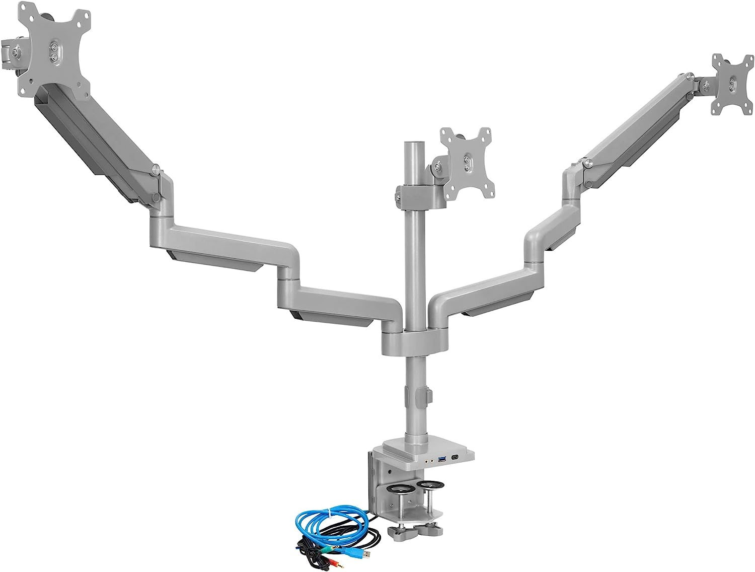 • FEATURES: Triple monitor stand has counter-balanced gas spring arms for effortless adjustments and features (1) USB 3.0 port, (1) audio port and matching extension cables for each. Has integrated cable management to keep your cords out of sight and is made out of heavy duty steel and aluminum alloy. Comes with interchangeable C-clamp and grommet base mounts for desktops up to 4 inches wide.