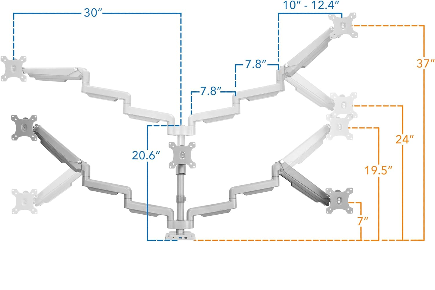 • FULLY ADJUSTABLE: Three monitor stand outer arms can tilt up and down 90 degrees, swivel 360 degrees left and right, raise and lower, and monitors can be rotated and placed in portrait or landscape orientation independent of one another. TURN HEX BOLT ON TOP OF OUTER ARMS TO ADJUST THE GAS SPRING TENSION TO HOLD SCREENS IN PLACE (SEE VIDEO FOR DETAILS). Center monitor can be height adjusted with a tool-free turn of the mounting bracket arm.