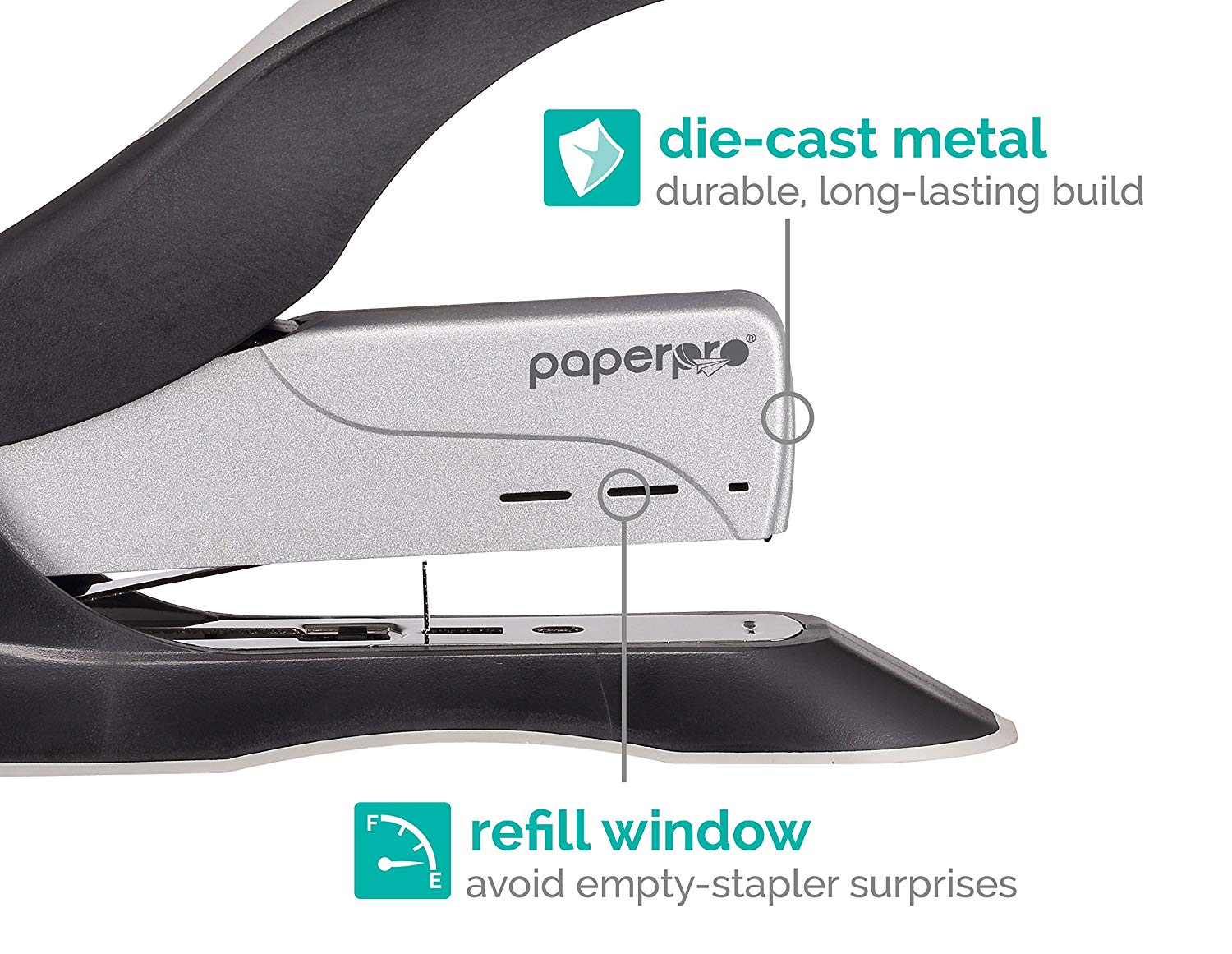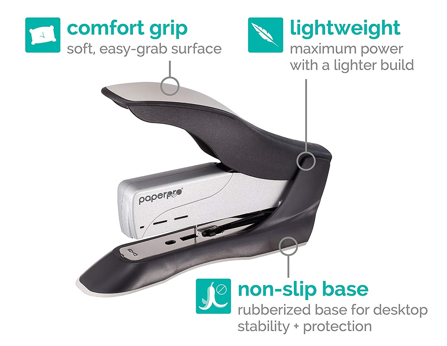 - The ultra-lightweight, smooth ergonomic design allows for easier use when held, or taken on-the-go in a backpack or travelbag so you can comfortably staple without missing a sheet. Full strip (210) staple capacity; uses standard staples. For optimal performance, use PaperPro Premium Standard Staples (1901). Three-Year Limited Warrant