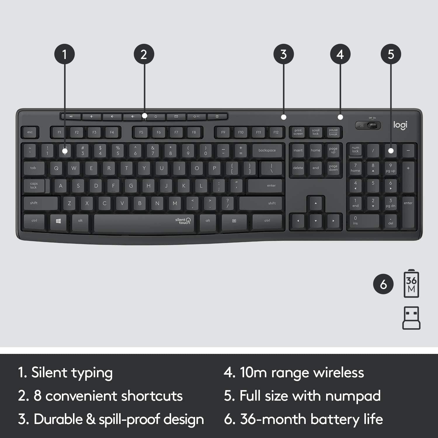 36-month keyboard and 18-month mouse battery life, plus on / off switches, to reduce the hassle of changing batteries