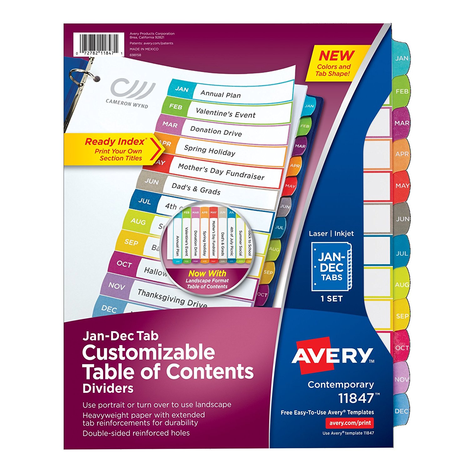 Bold, bright and beautiful, these colorful dividers offer a variety of styles for organizing your important documents with color-coded index tabs and a color-coordinated Table of Contents page. Double-sided reinforced binding edge and extended reinforcement on tabs helps prevent tearing. Dividers may be used with a portrait or landscape orientation. For laser and inkjet printers.