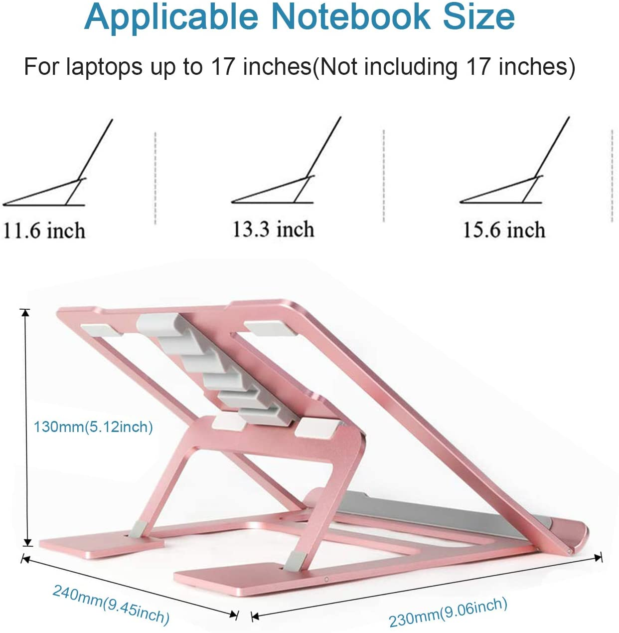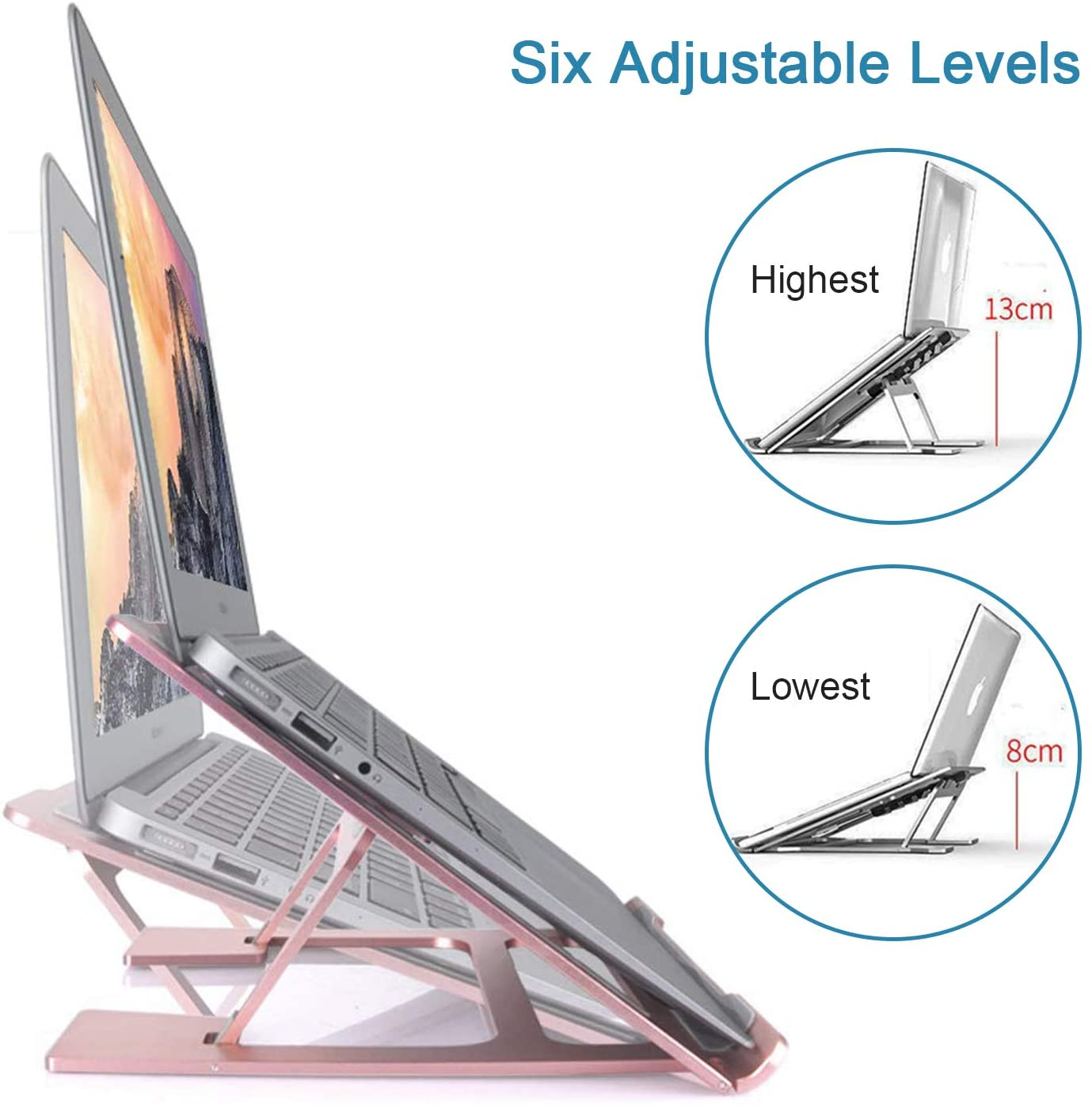 - Adjustable in 6 Levels & Ergonomic--6 adjustable heights adjustments laptop stand options (angles adjust 18 to 35 degrees ) will hold your notebook at an ergonomic angle design which adjust to suit the best visual and prevent eyestrain and even eliminate hand fatigue.
