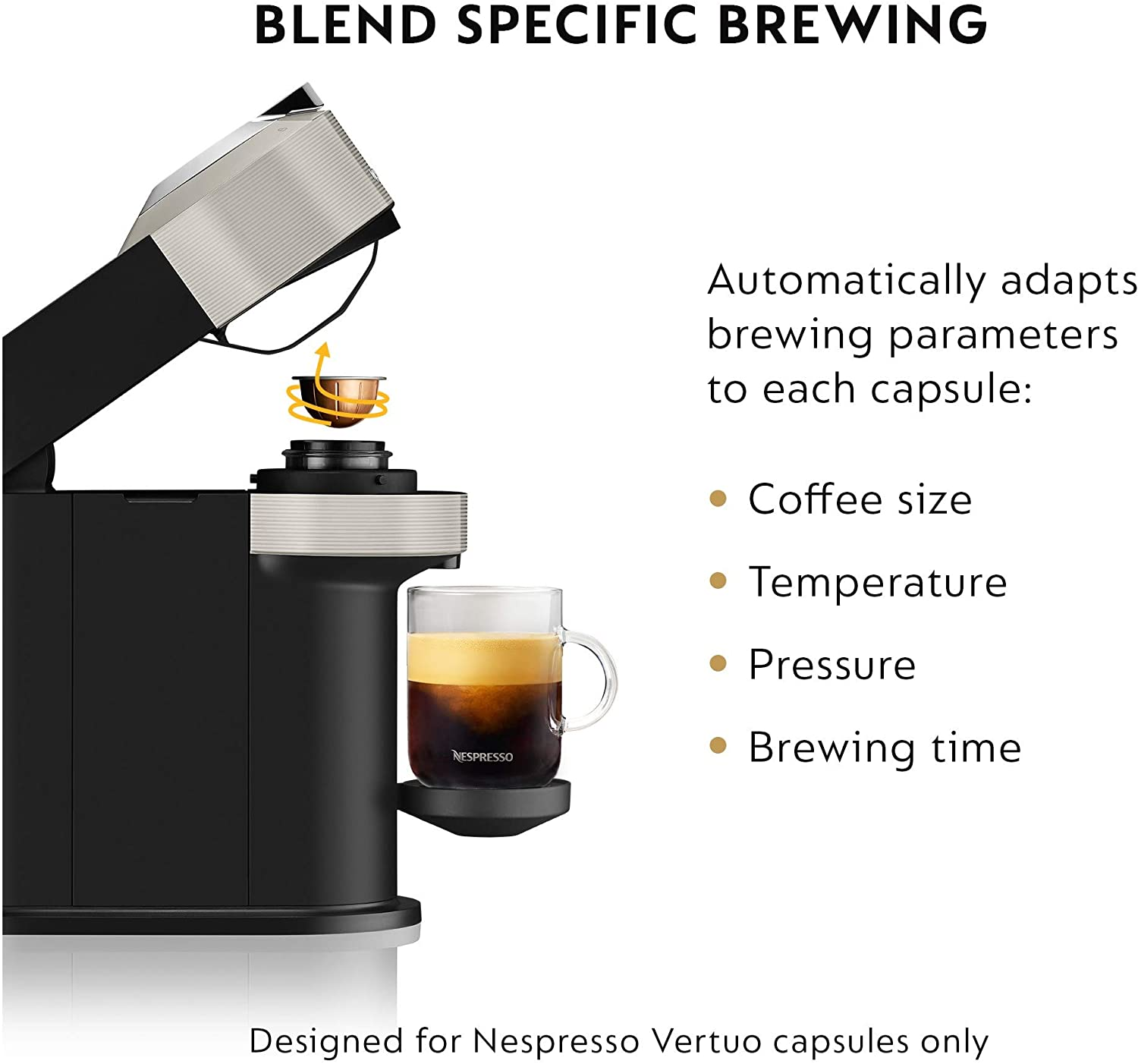 - QUALITY ENABLED BY TECHNOLOGY:This Nespresso Vertuo machine delivers the optimal in-cup results for each blend using capsule-specific brewing with barcode reading resulting in a silky crema atop the coffee; a signature of a truly great cup of coffee