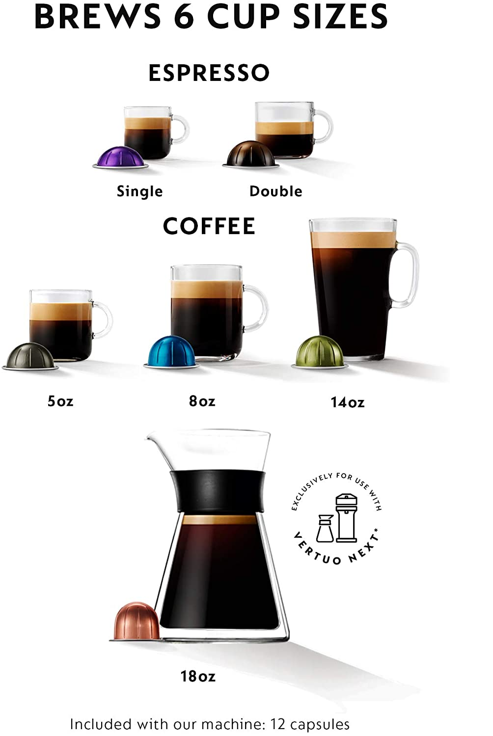 - IMPOSSIBLY GOOD QUALITY: The only Nespresso Vertuo machine that brews 6 sizes: coffee (5 oz, 8 oz, and 14oz), Espresso (single and double) New pour-over style caraffe (18 oz) coffee exclusively for Vertuo Next