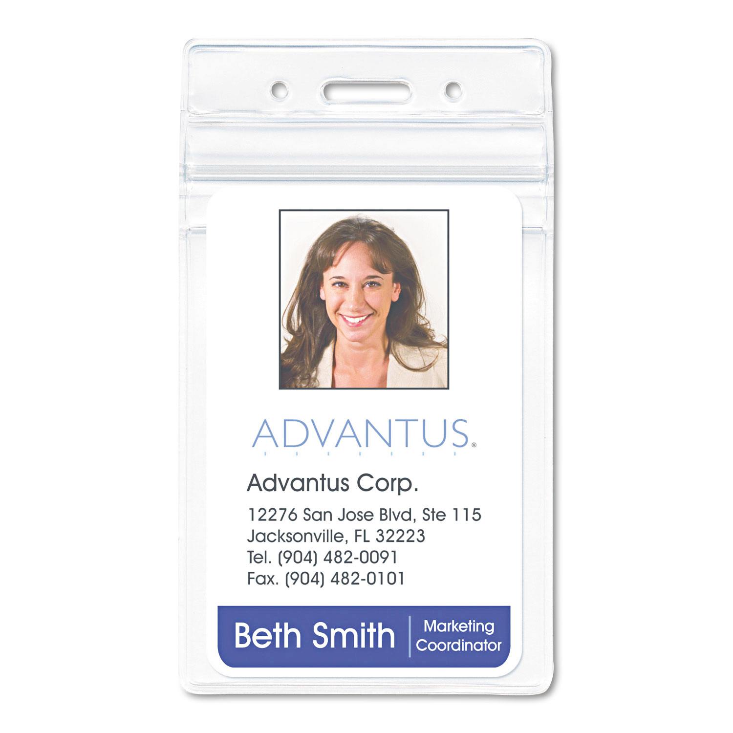 - : ClearThe ideal choice for ID cards and name badges, these ADVANTUS PVC-Free Badge Holders are made of durable, long-lasting vinyl. Sized to hold up to 3 x 4 inch inserts, these vertical badge holders are each pre-punched for chain or clip use (chains/clips sold separately). Badges or ID cards will be securely protected from the elements and easy to access for swiping at security checkpoints. Available in a box containing 50 badge holders, these are an excellent choice for small or large office use. ADVANTUS Corp. is dedicated to providing innovative quality products at fair price