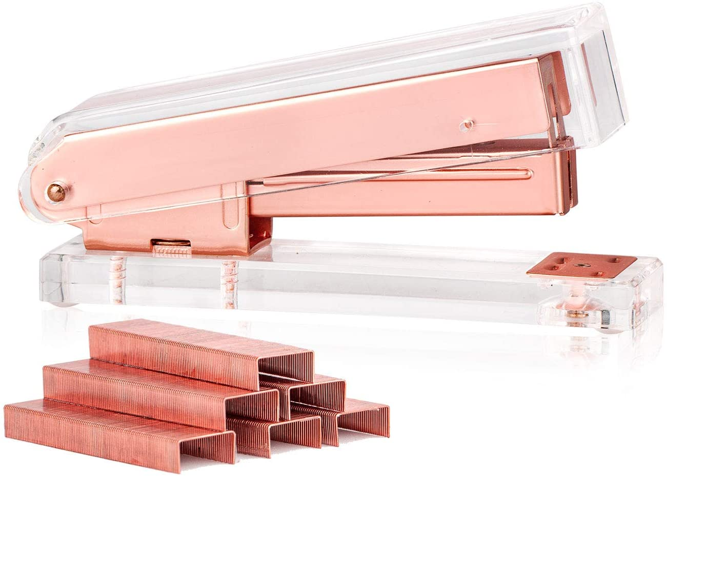 - BRIGHTEN UP YOUR DESK - This beautiful stapler is truly unique for any office supplies and stationery. It has luxury rose gold metal front and ultra transparent clear acrylic body with smooth polished edges. It is visually gorgeous and guaranteed to enhance your office and home workspace.