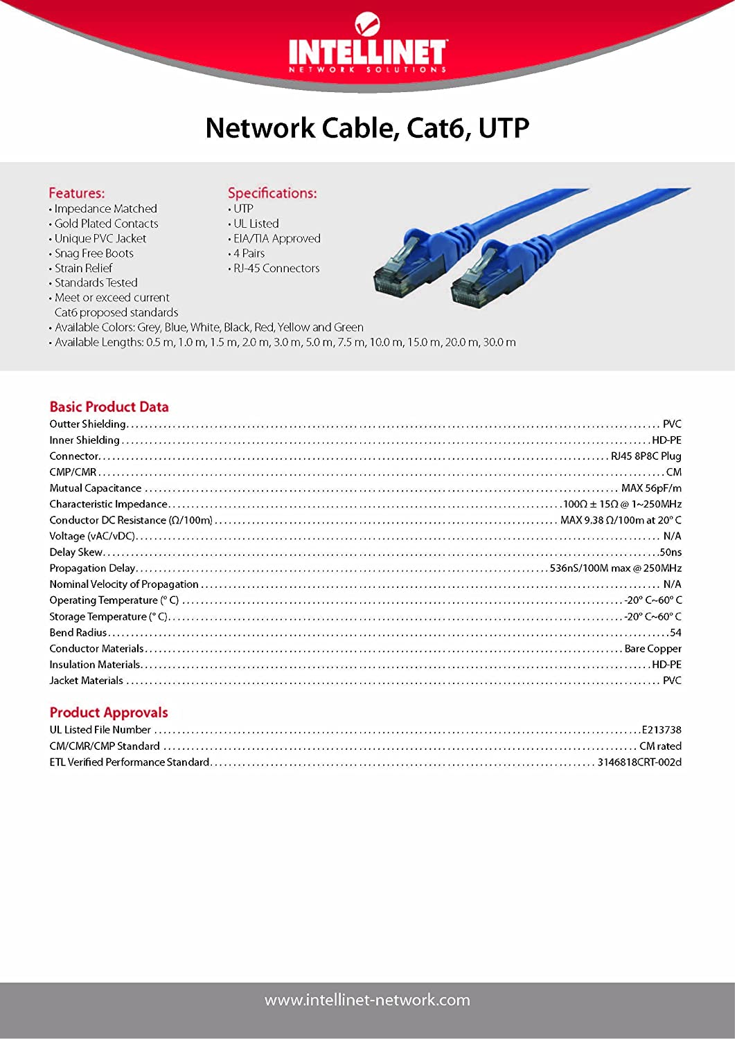 Intellinet Network Solutions Cat6 RJ-45 Male/RJ-45 Male UTP Network Patch Cable, 1-Foot