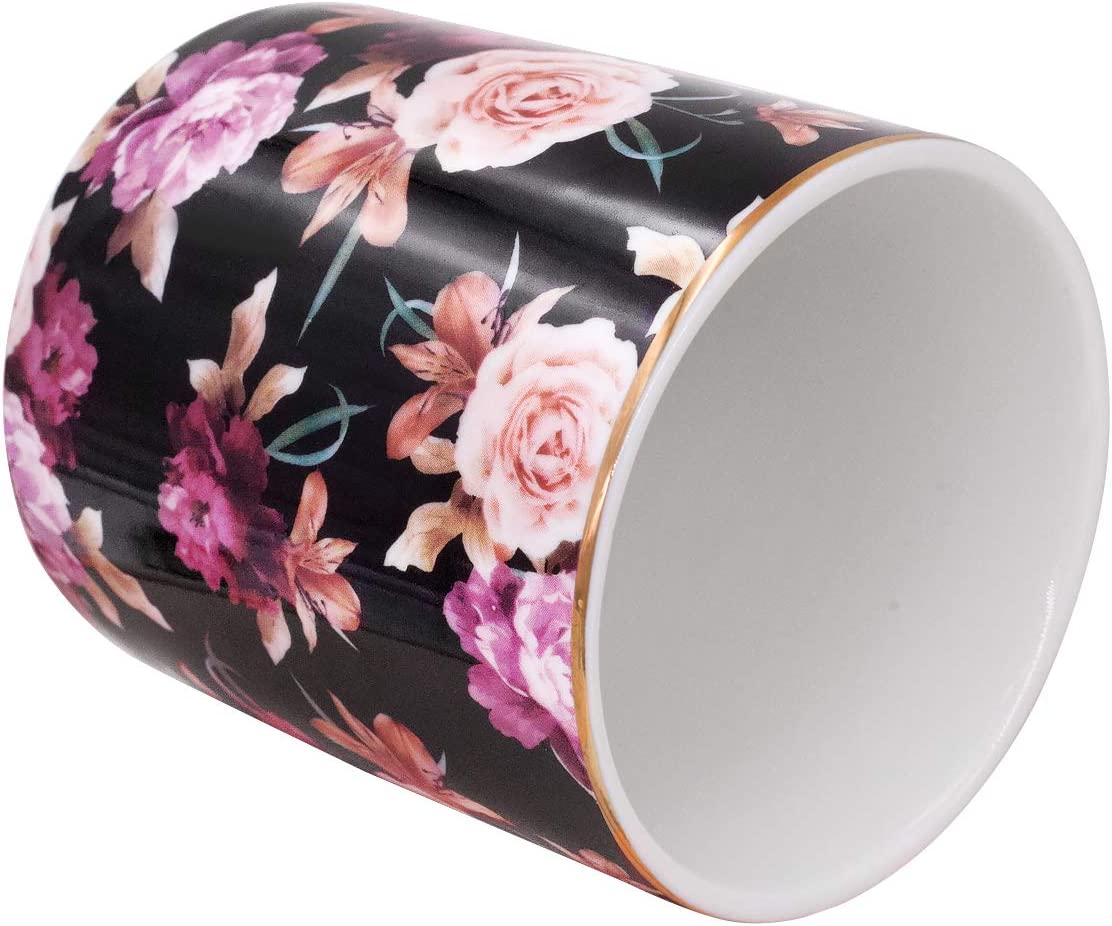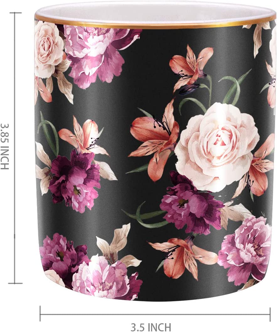 WAVEYU Pen Holder for Desk, Pencil Cup Holder for Desk, Cute Floral Makeup Brush Holder Durable Ceramic Flower Design Desk Pencil Organizer for Office, Classroom, Black