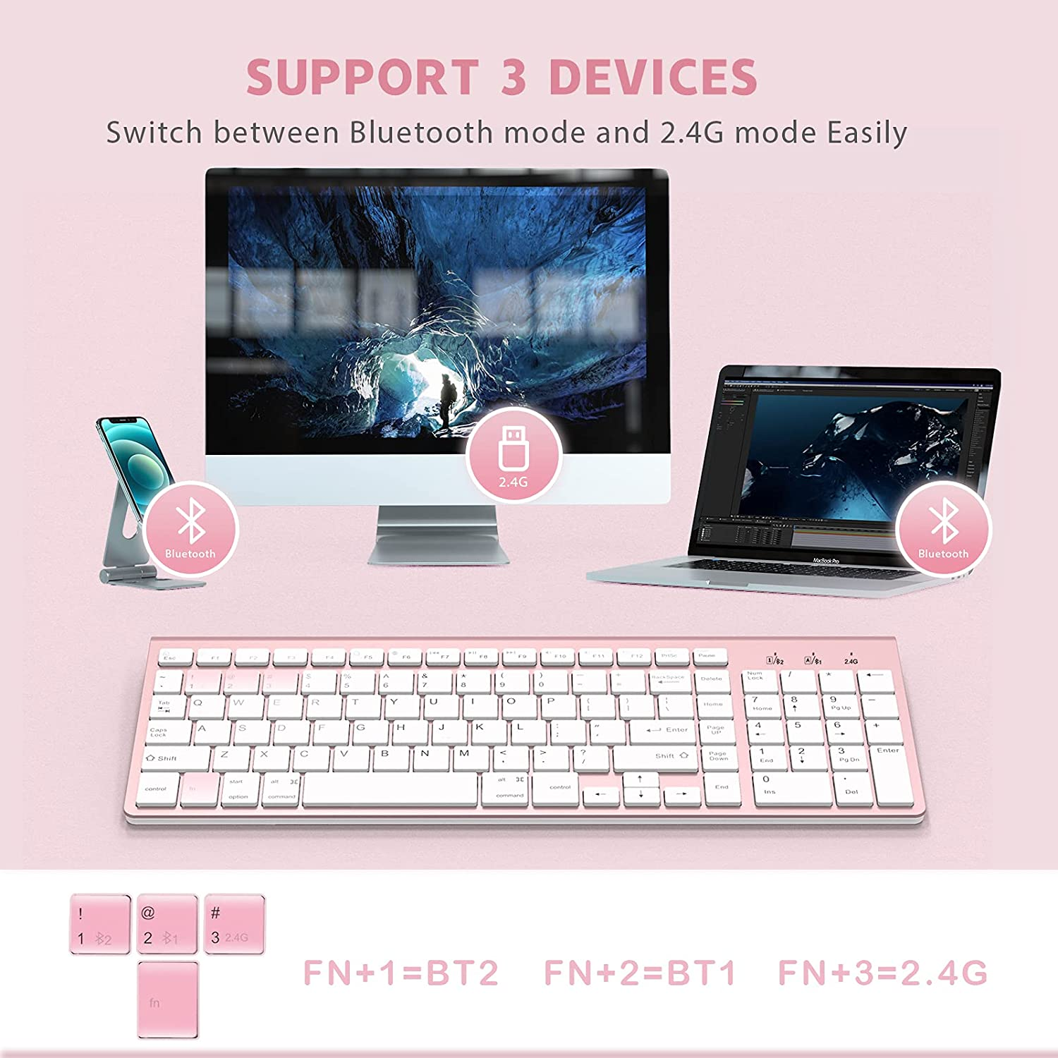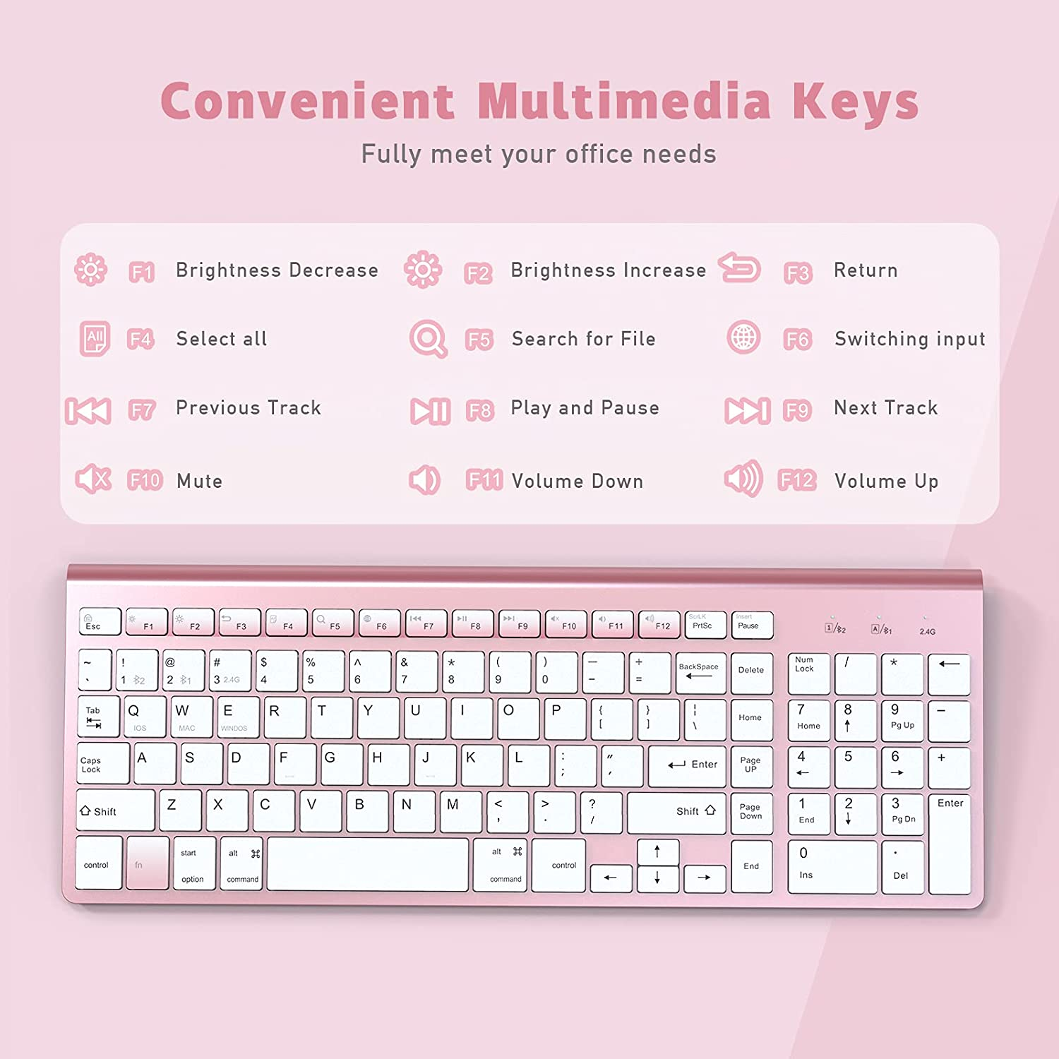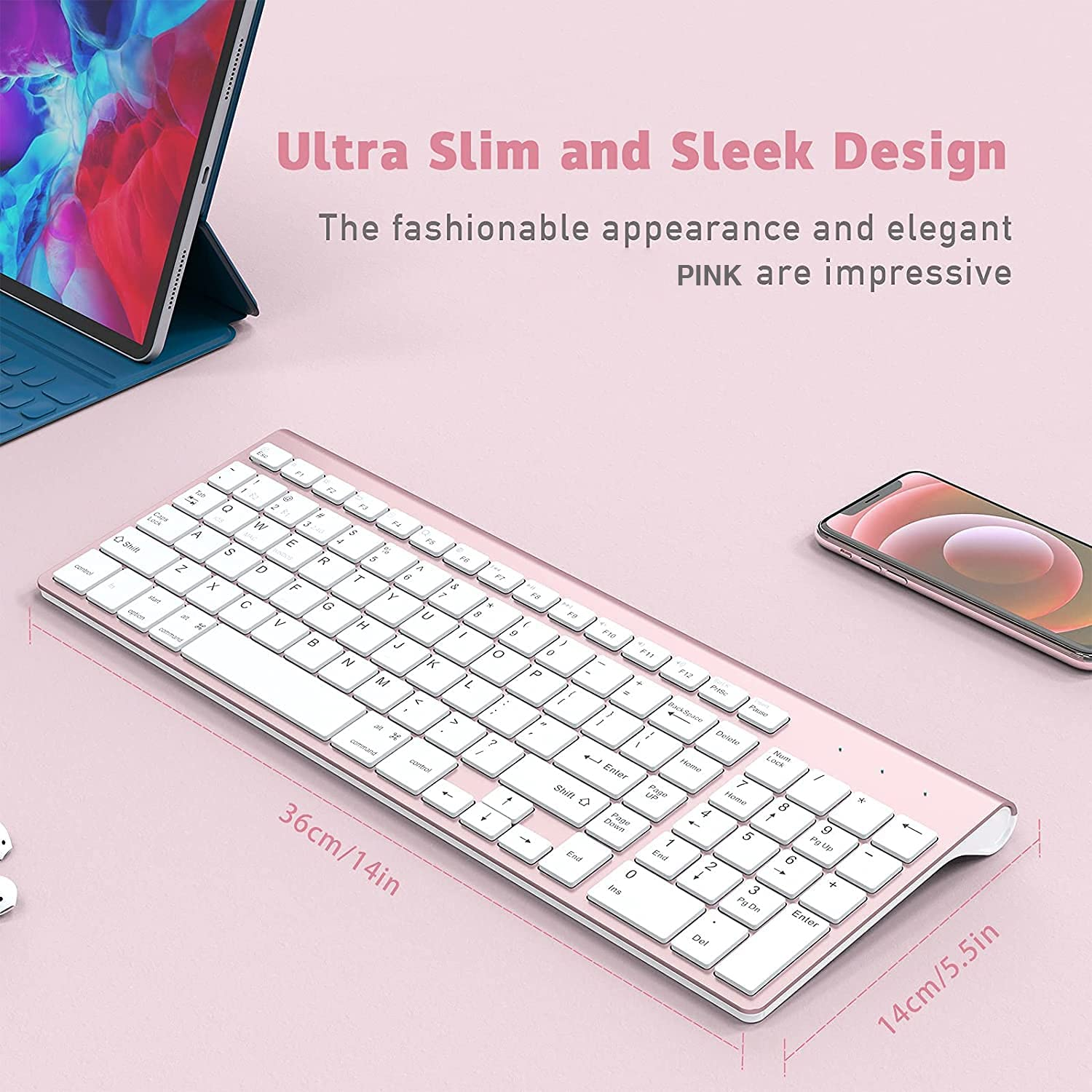 - Stylish and Compact --The keyboard and mouse have a formal and cute design. The top adopts the pearl white GXUV surface treatment technology and the design of the center line gilding, which adds a unique pink color to the home office life.