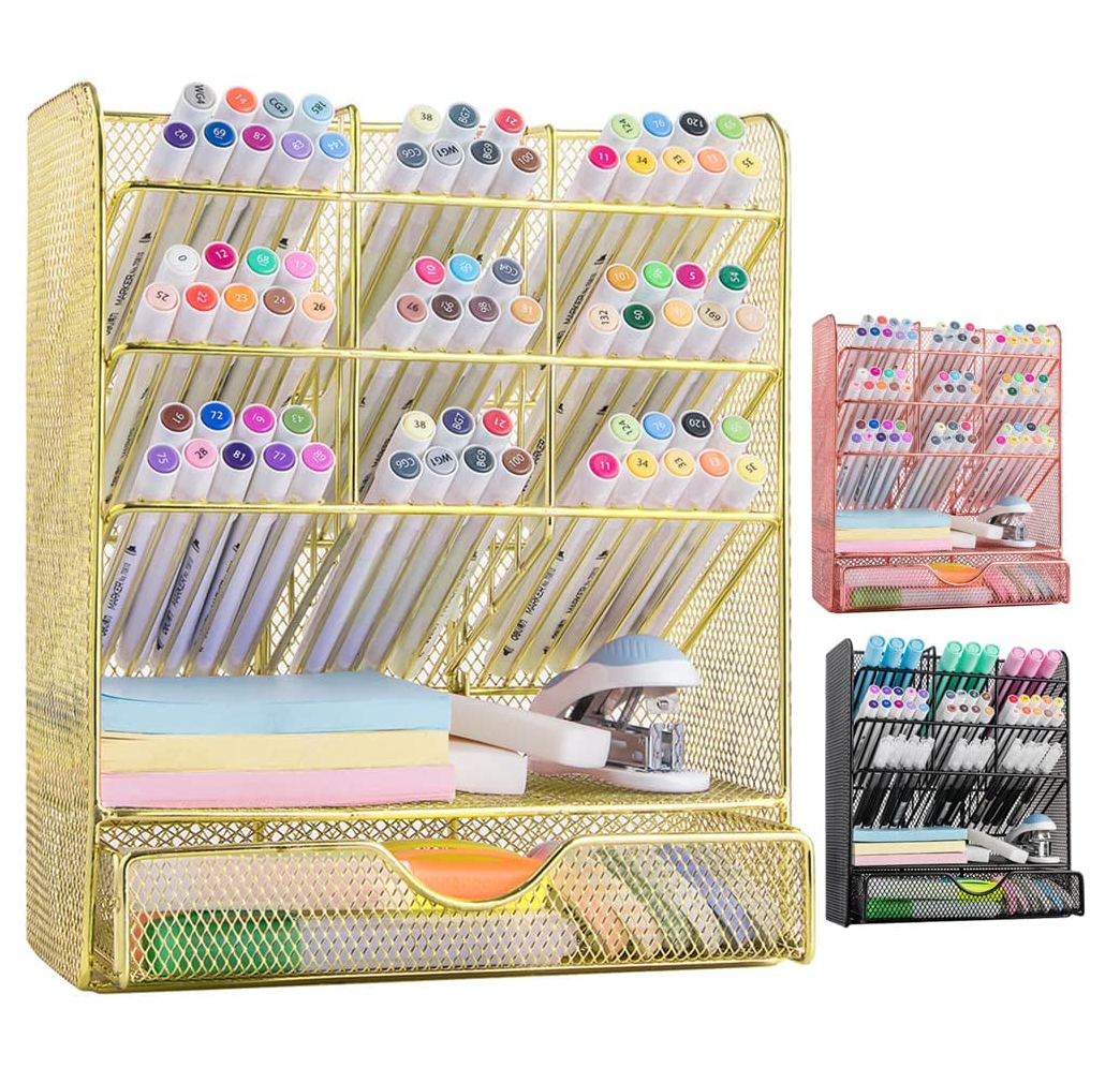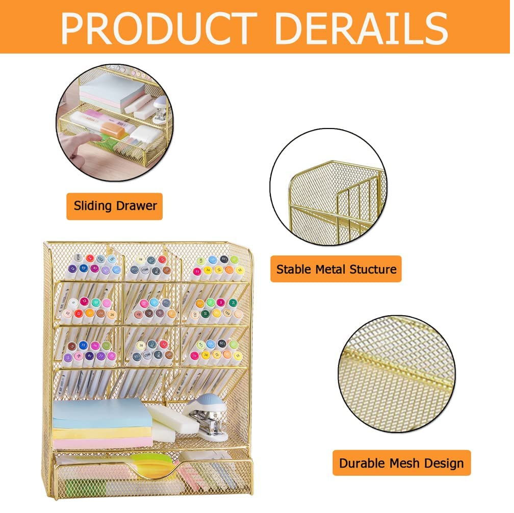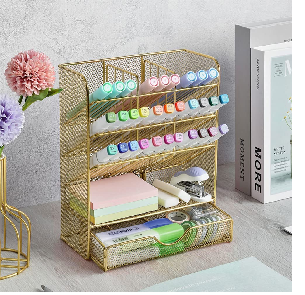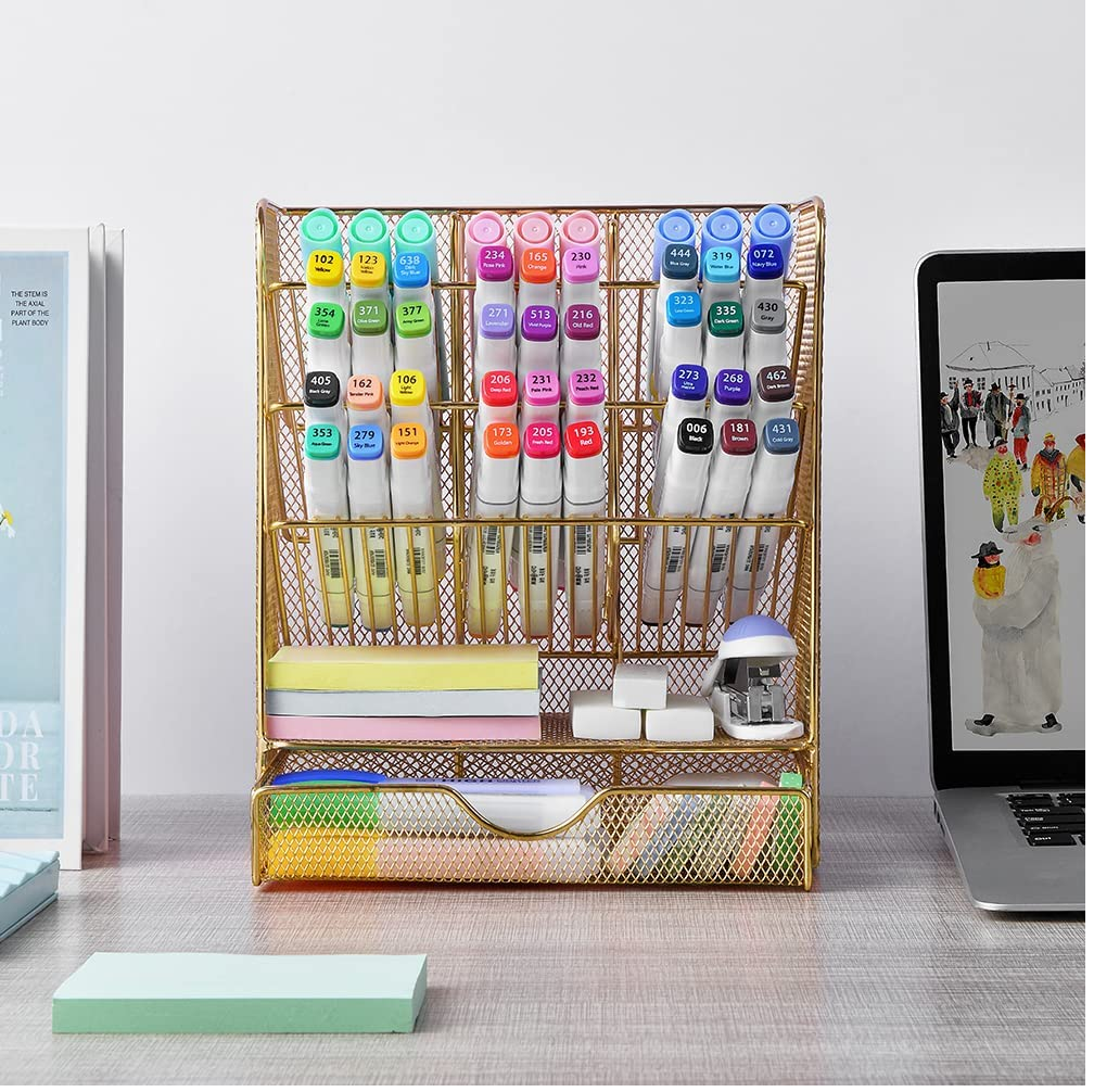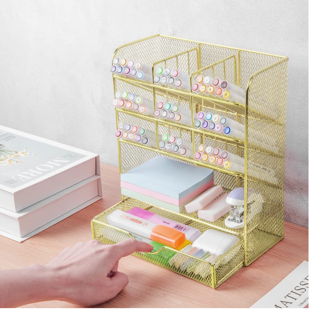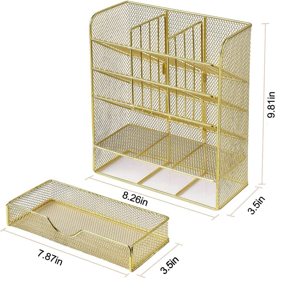 Spacrea Mesh Pen Organizer - Pencil Holder for Desk, Desk Organizer with Drawer for School, Home, Art Supplies (Gold)