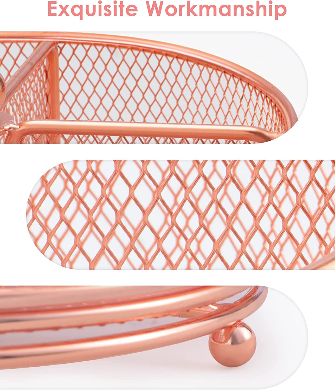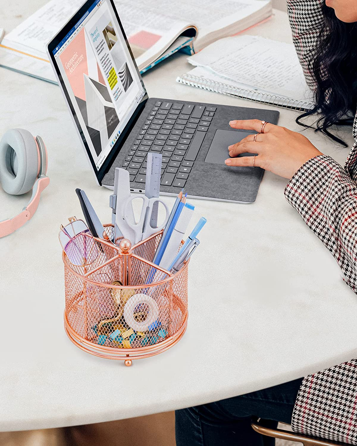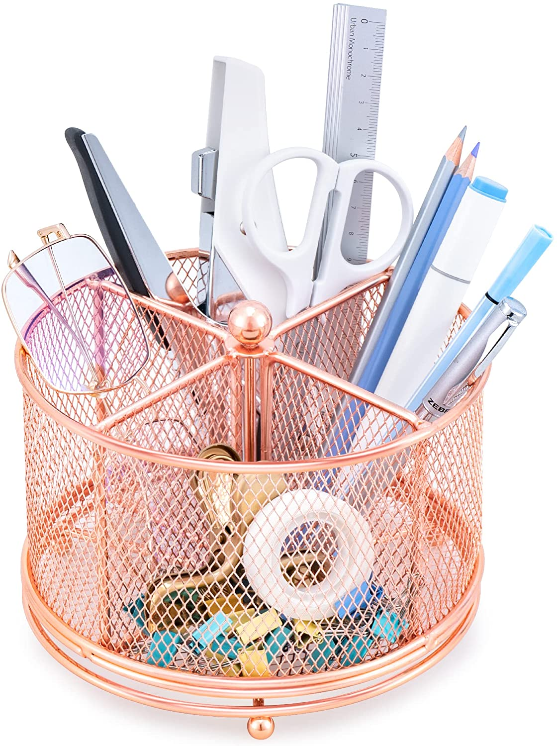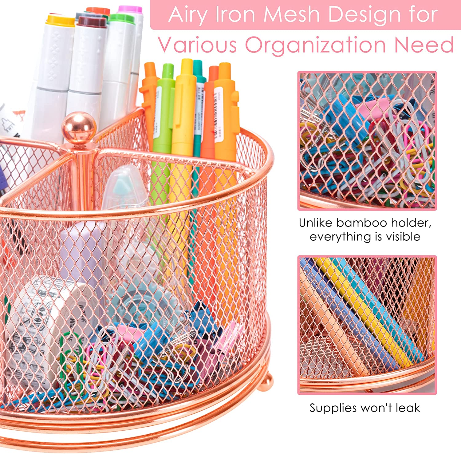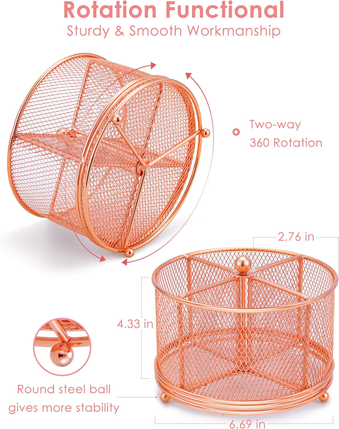 - EXQUISITE WORKMANSHIP - Varhomax rotating desktop organizer is sturdily built with high-quality metal mesh and thick strips. And it can keep consistent sleek gloss with rose gold electroplating process instead of thermal spraying process (appearance peal off with use). It fits all style and all space. Its rose gold stylish appearance adds perfect elegance to your desktop, especially for women.