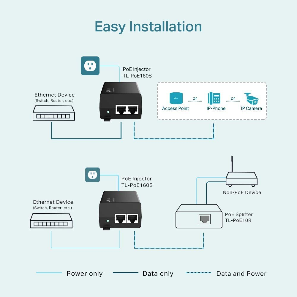 - 802.3at/af PoE Compliant - TL-PoE160S supplies power and data via one single ethernet cable to 802.3at/af PoE devices and expands network to areas with no power lines or outlets