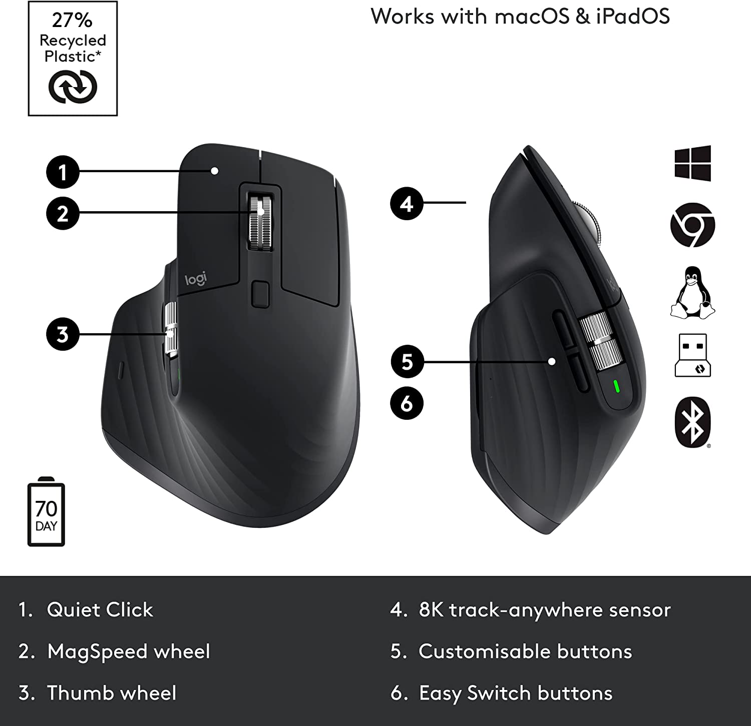 - Multi-device and multi-OS: Connect the comfort mouse with up to 3 devices via Bluetooth or the included Logi Bolt USB receiver (6) on Windows, macOS, Chrome OS or Linux