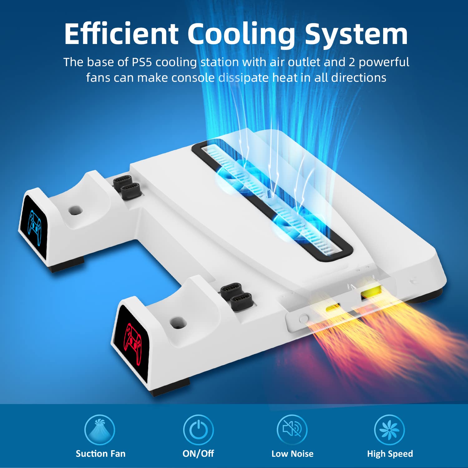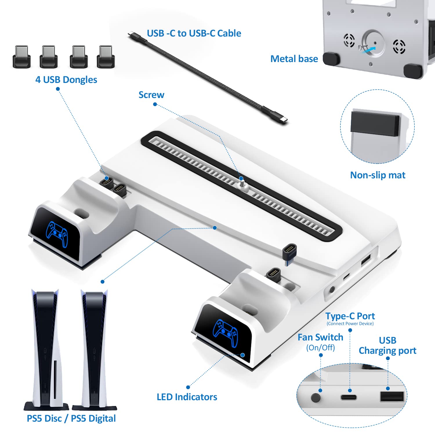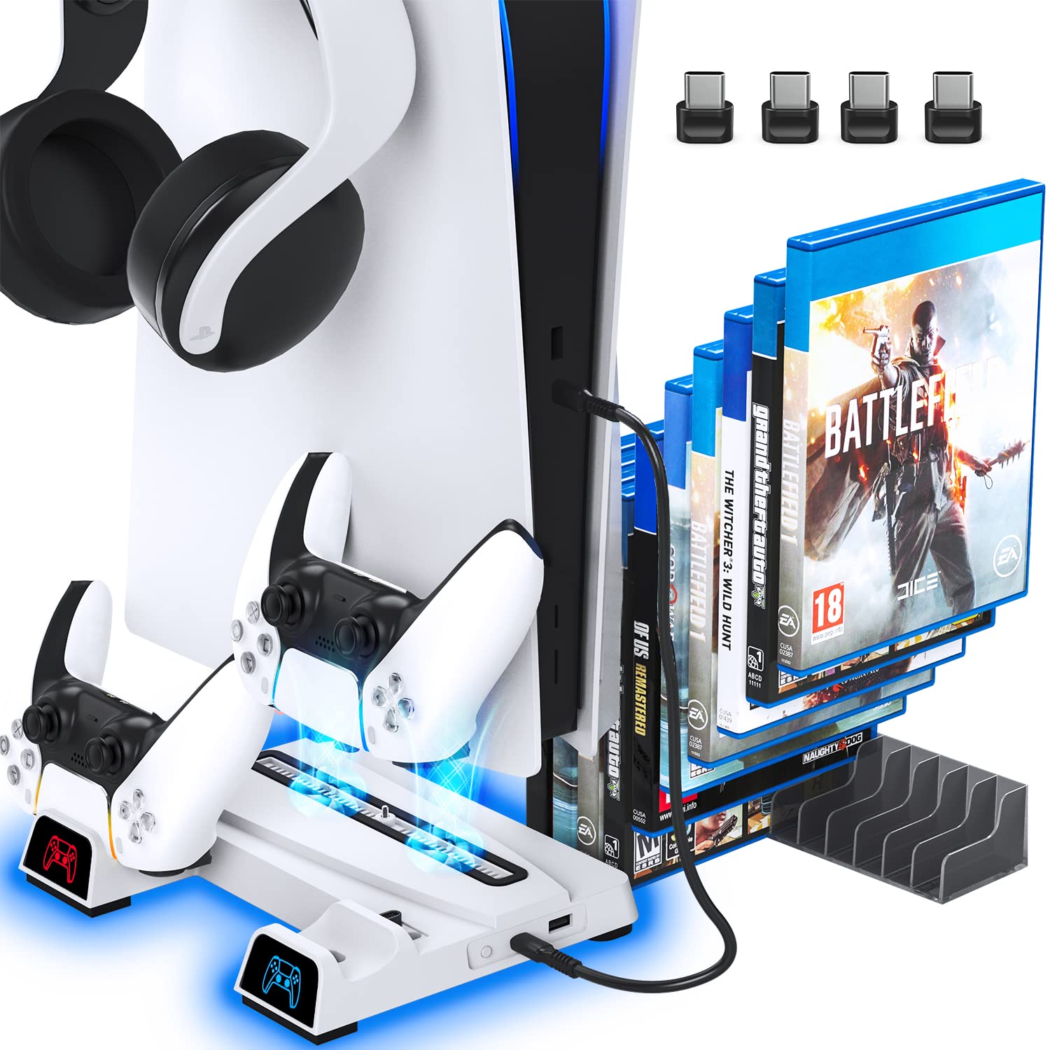 - 【All-In-One PS5 Cooling Fan】Compatible with both Playstation 5 Digital Edition & Disc Edition Consoles, this compact PS5 charger station comes with efficient cooling fan, dual controller chargers, 2.0 USB port, 10 games storage and headset holder for PS5 playstation console. Multifunctional PS5 Holder Stand is an essential accessory to meet your need of charging and organizing.
