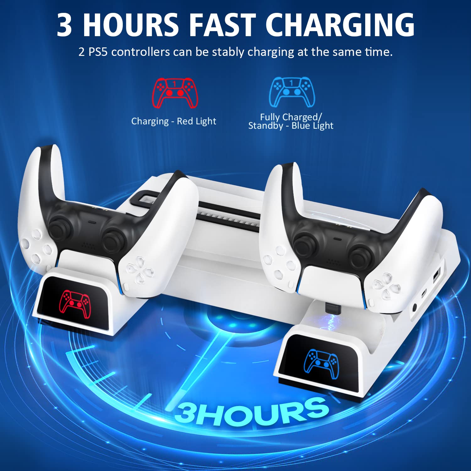 - 【Fast Charging】Plug the dongles into the controllers then fully charge up to 2 Playstation 5 controllers simultaneously within 3 hours. LED indicator of PS5 Charging Cooling Station is handy to know the charging status which red light is for charging and blue light is for fully charged status.
