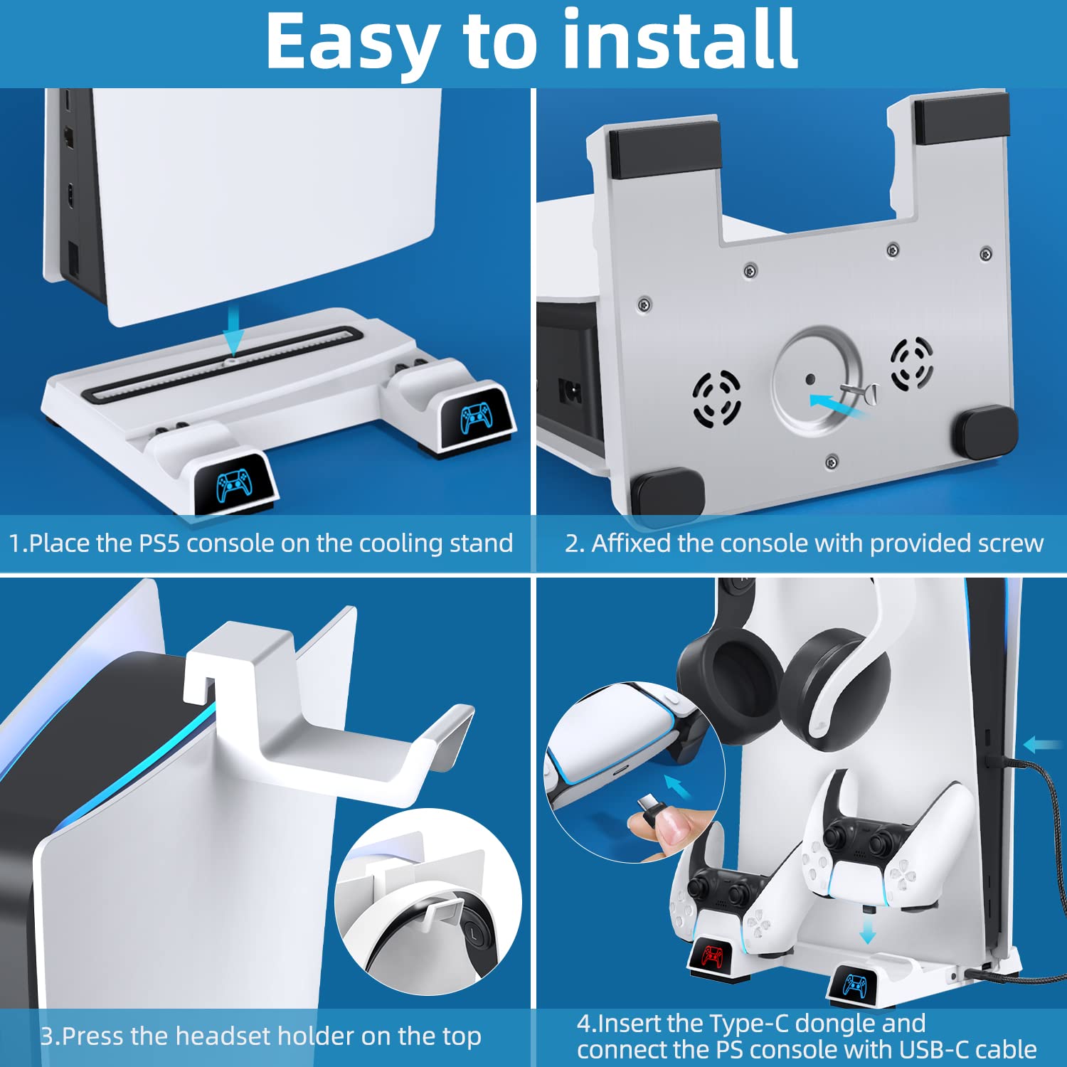 - 【Easy to Assemble】Just affix the PS5 console to cooling station with charger with included screw to make it more stable. The headphone hanger perfectly attaches to the console and keeps your accessories organized.