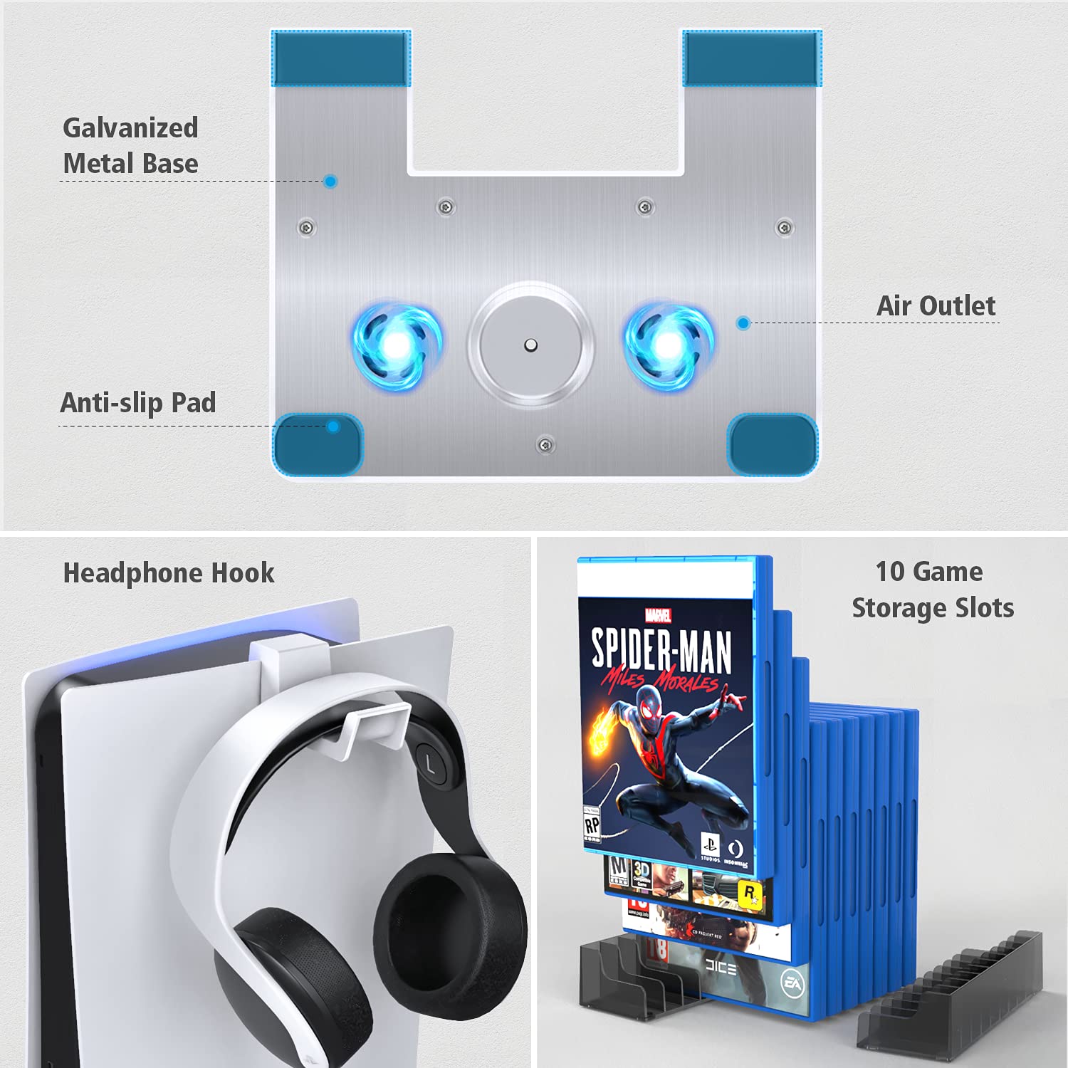 - 【Excellent PS5 Cooling System】The minimalist-design PS5 stand with 2 mute cooling fans helps exhaust excess heat from the bottom of your Playstation 5 consoles, keeping your PS5 consoles breath, ventilate and cool in a reasonably quiet status. Featuring high level cooling fan and fast heat dissipation, this PS5 cooling stand with metal base is perfect for improving console's lifespan and performance.