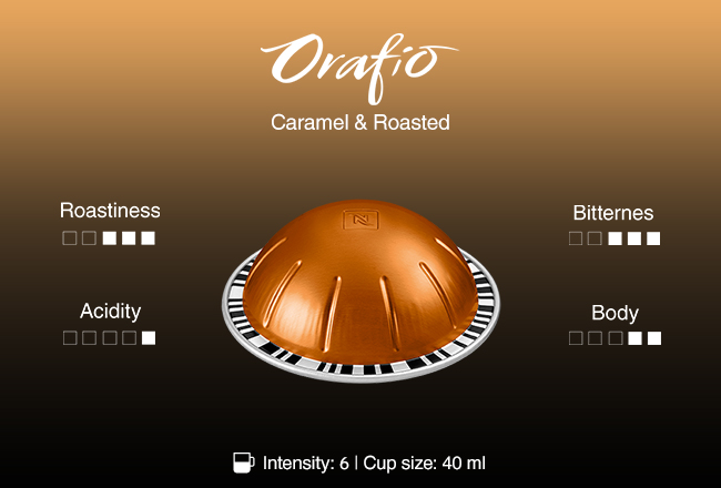 Orafio shines in your cup with its warm notes of toasted grain. An espresso (40ml) made from Latin American Arabicas with a little Ugandan Robusta. This coffee has a light body, low bitterness and captivates your taste buds with a hint of acidity.
