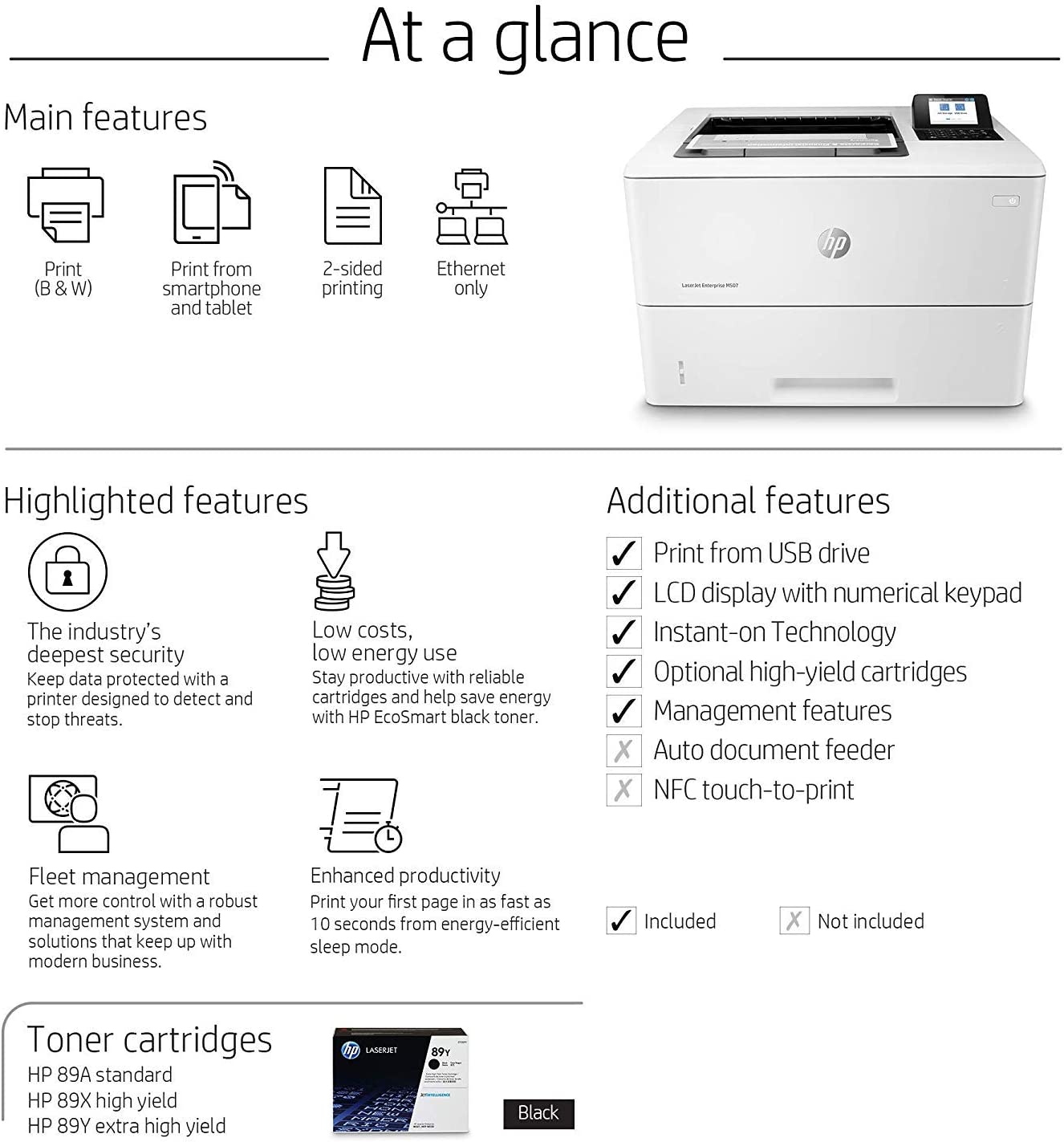 Work securely and efficiently and get high-quality results with the LaserJet Enterprise M507dn Monochrome Printer from HP. Featuring two input trays, which hold a total of 650 sheets of paper, and a 250-sheet output tray to hold printed documents, the printer's 1200 x 1200 dpi print resolution ensures sharp text on business documents, letterhead, envelopes, and labels. First print-out speeds are as fast as 5.9 seconds, and once running, the M507dn has an impressive print speed up to 45 ppm. A 2.7" LCD with keypad lets you quickly manage printer settings and jobs, and the unit comes with USB 2.0 and Ethernet connectivity. Standard toner cartridge yield is approximately 5000 pages, with options for high-yield and extra-high-yield cartridges rated for 10,000 and 20,000 pages, respectively.