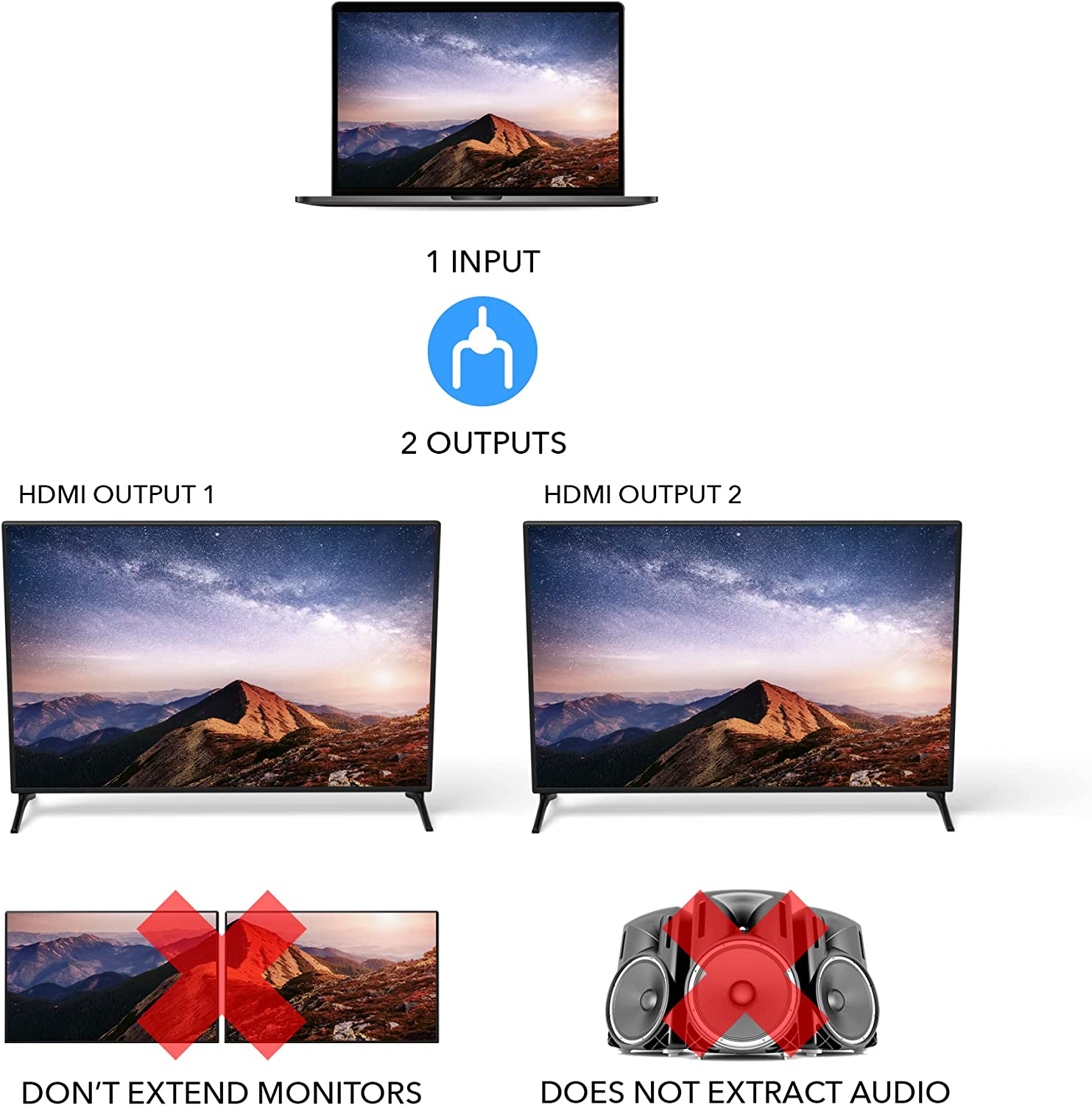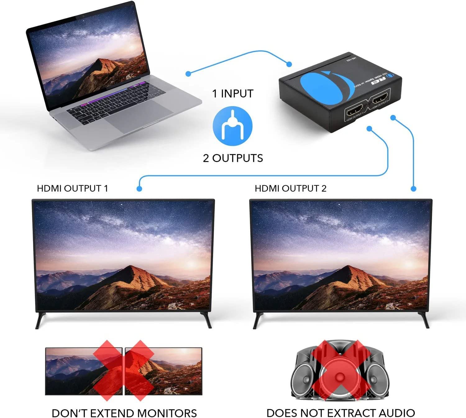 Out: THIS UNIT DOES NOT EXTEND MONITORS - ONLY Split one HDMI input signal to