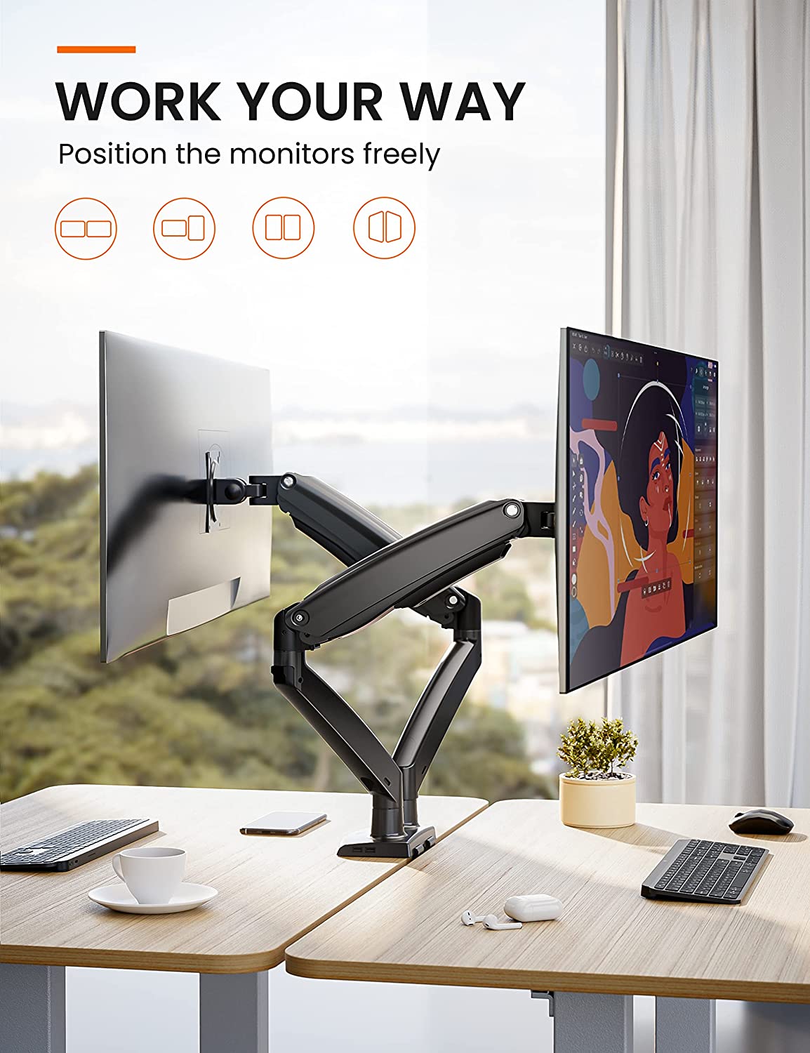& Stable Dual Monitor Arm: Two heavy-duty monitor arms with premium gas springs support
