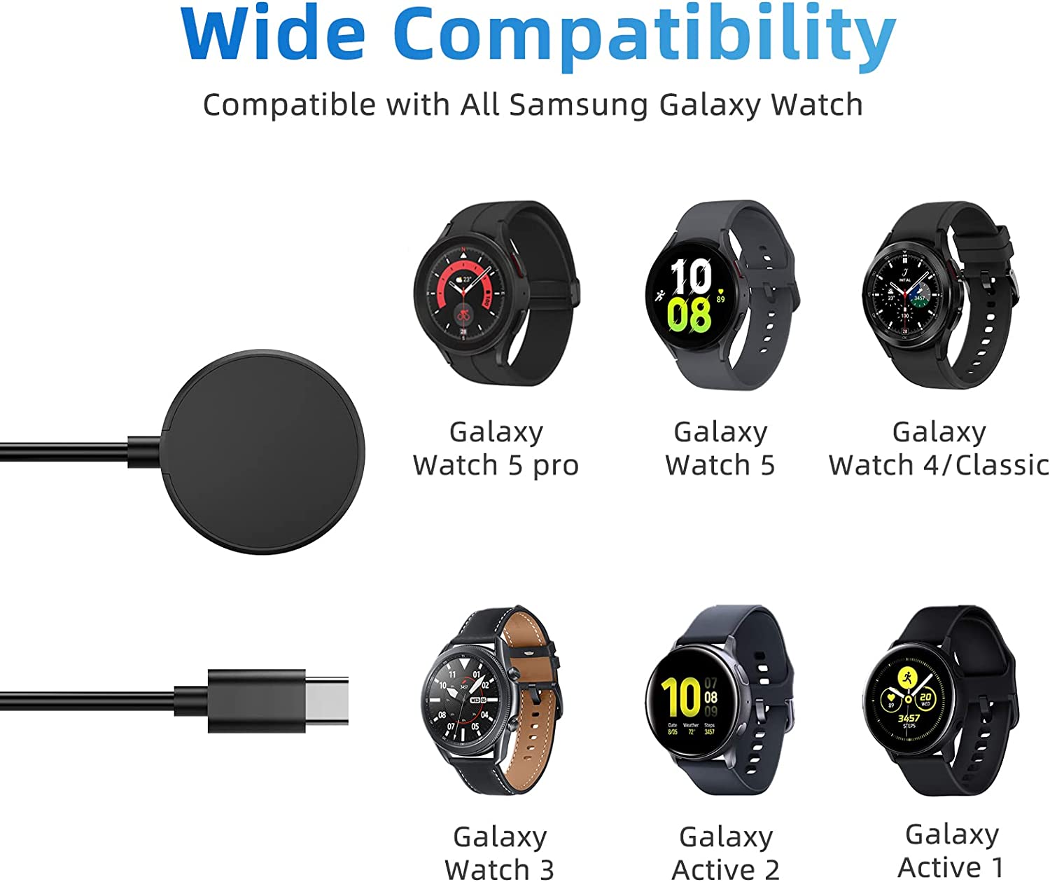 • Wide Compability - The charger for samsung watch charger is widely compatible with Samsung Galaxy Watch 5 40mm 44mm/ Watch 5 pro 45mm / Galaxy Watch 4 40mm 44mm/ 4 Classic 42mm 46mm/ Galaxy Watch 3 41mm 45mm/ Active 2 / 1. Compatible with all of the Galaxy series smart watches.