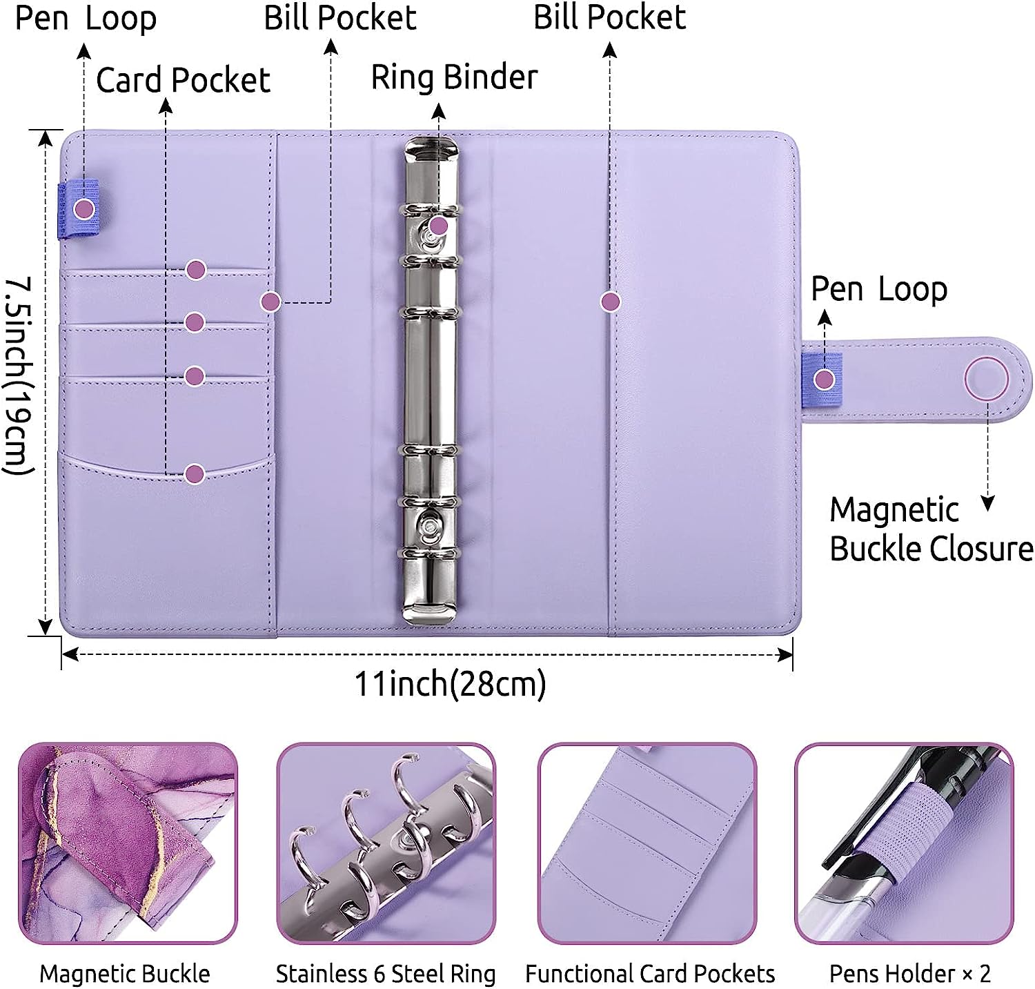 cover,Premium PU leather A6 binder has many hidden compartments and pen