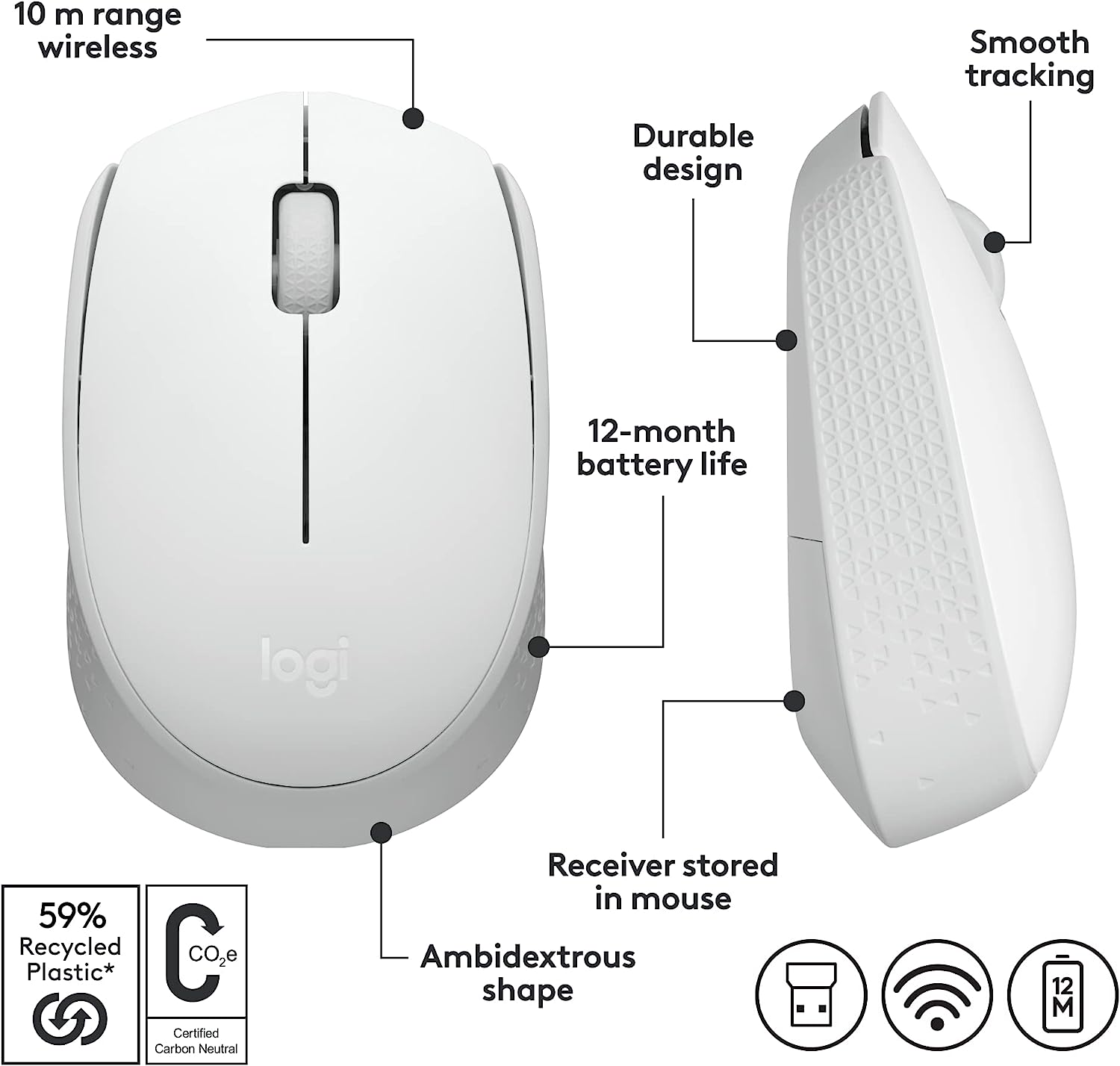 Logitech M170 Ambidextrous Wireless Mouse - Off White