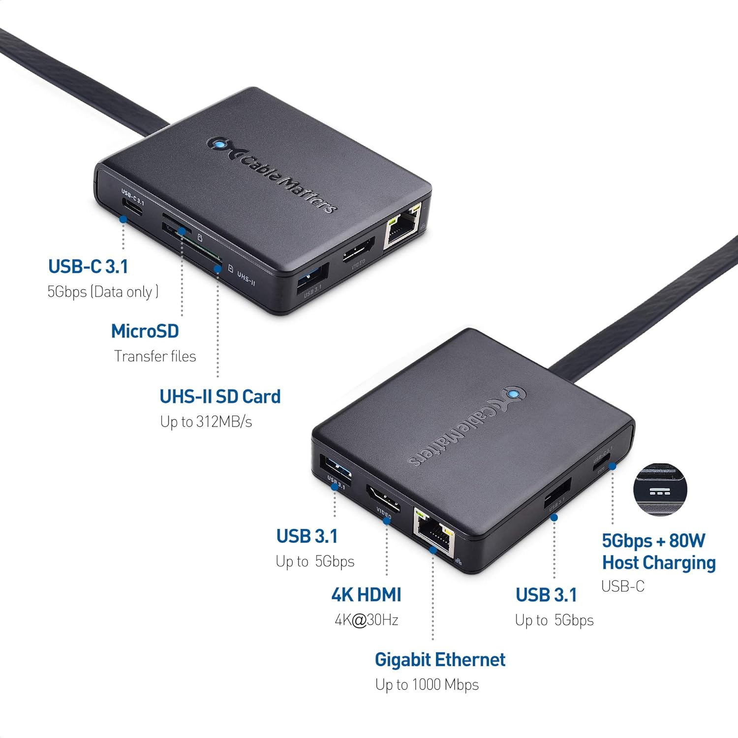 - USBC dock instantly adds SD and MicroSD card reader slots, Gigabit Ethernet, 2x USB 3.0 (USB 3.1 Gen 1), 2x USB-C, 4K HDMI, and 80W charging power over a single USB-C connection; The Bus-powered USBC hub can operate with or without a USB-C charger