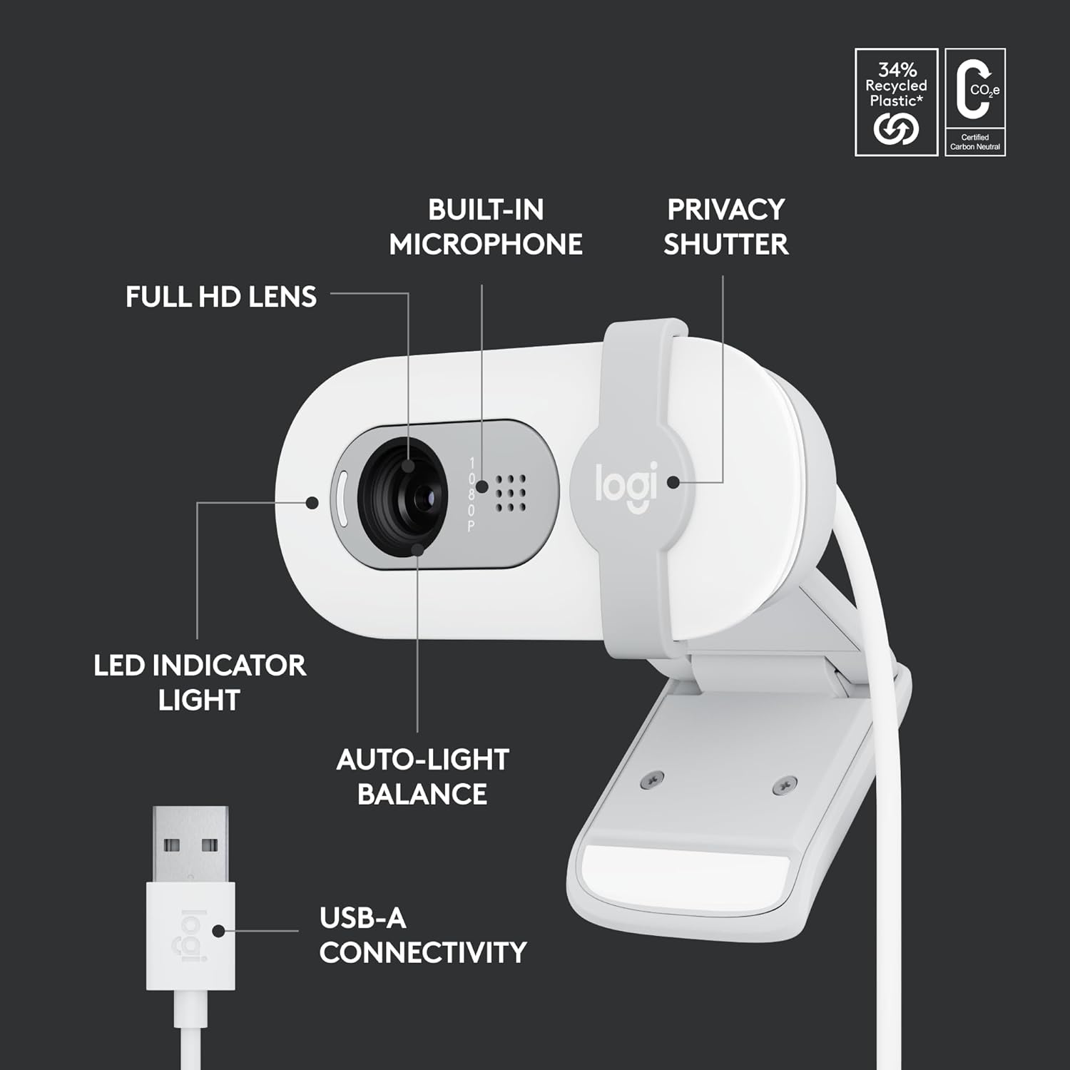 Logitech Brio 100 Full HD 1080P Webcam w/ Built-in Microphone - Off White