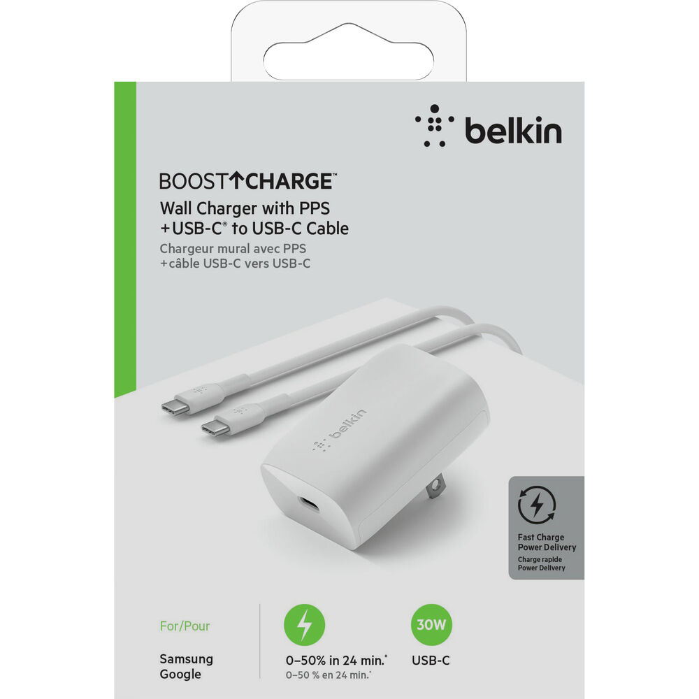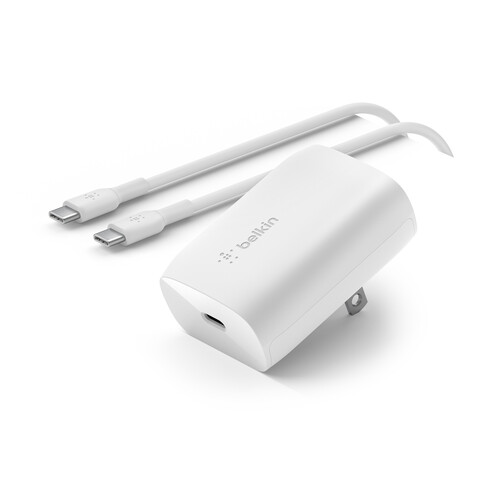 Ideal for both travel and your home, the BoostCharge USB-C PD 30W Wall Charger with USB-C Cable from Belkin features a fold-out plug on the back of the charger. This lets the BoostCharge sit flatter and closer to the wall. With a 2-prong design, you can orient it to have the single USB-C port on top or the bottom. Either way, you can more easily use it in tight spaces and behind furniture. The charger supports Power Delivery 3.0 for fast-charging mobile devices with up to 30W of power. PPS technology is also employed for safer charging, detecting the power requirements of the connected device.